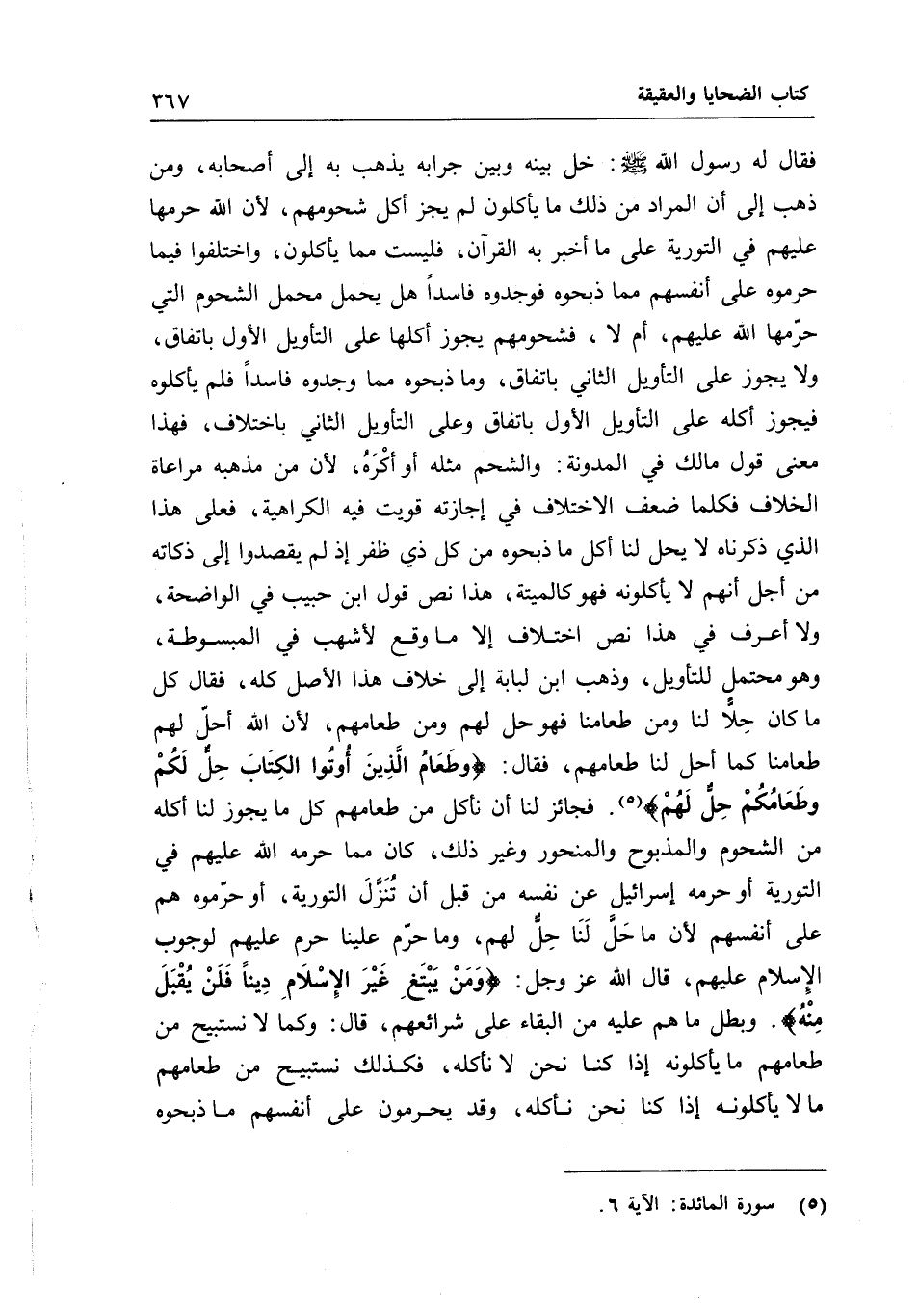 فقال له رسول الله - صَلَّى اللَّهُ عَلَيْهِ وَسَلَّمَ -: خل بينه وبين جرابه يذهب به إلى أصحابه» ، ومن ذهب إلى أن المراد من ذلك ما يأكلون لم يجز أكل شحومهم؛ لأن الله حرمها عليهم في التورية على ما أخبر به القرآن، فليست مما يأكلون، واختلفوا فيما حرموه على أنفسهم مما ذبحوه فوجدوه فاسدا هل يحمل محمل الشحوم التي حرمها الله عليهم، أم لا، فشحومهم يجوز أكلها على التأويل الأول باتفاق، ولا يجوز على التأويل الثاني باتفاق، وما ذبحوه مما وجدوه فاسدا فلم يأكلوه فيجوز أكله على التأويل الأول باتفاق وعلى التأويل الثاني باختلاف، فهذا معنى قول مالك في المدونة: والشحم مثله أو أكره؛ لأن من مذهبه مراعاة الخلاف فكلما ضعف الاختلاف في إجازته قويت فيه الكراهية، فعلى هذا الذي ذكرناه لا يحل لنا أكل ما ذبحوه من كل ذي ظفر إذ لم يقصدوا إلى ذكاته من أجل أنهم لا يأكلونه فهو كالميتة، هذا نص قول ابن حبيب في الواضحة، ولا أعرف في هذا نص اختلاف إلا ما وقع لأشهب في المبسوطة، وهو محتمل للتأويل، وذهب ابن لبابة إلى خلاف هذا الأصل كله، فقال: كل ما كان حلا لنا ومن طعامنا فهو حل لهم ومن طعامهم؛ لأن الله أحل لهم طعامنا كما أحل لنا طعامهم، فقال: {وَطَعَامُ الَّذِينَ أُوتُوا الْكِتَابَ حِلٌّ لَكُمْ وَطَعَامُكُمْ حِلٌّ لَهُمْ} [المائدة: 5] . فجائز لنا أن نأكل من طعامهم كل ما يجوز لنا أكله، من الشحوم والمذبوح والمنحور وغير ذلك، كان مما حرمه الله عليهم في التورية أو حرمه إسرائيل عن نفسه من قبل أن تنزل التورية، أو حرموه هم على أنفسهم؛ لأن ما حل لنا حل لهم، وما حرم علينا حرم عليهم لوجوب الإسلام عليهم، قال الله عز وجل: {وَمَنْ يَبْتَغِ غَيْرَ الإِسْلامِ دِينًا فَلَنْ يُقْبَلَ مِنْهُ} [آل عمران: 85] . وبطل ما هم عليه من البقاء على شرائعهم، قال: وكما لا نستبيح من طعامهم ما يأكلونه إذا كنا نحن لا نأكله، فكذلك نستبيح من طعامهم ما لا يأكلونه إذا كنا نحن نأكله، وقد يحرمون على أنفسهم ما ذبحوه