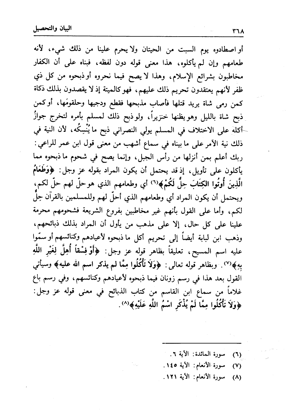 أو اصطادوه يوم السبت من الحيتان ولا يحرم علينا من ذلك شيء؛ لأنه طعامهم وإن لم يأكلوه، هذا معنى قوله دون لفظه، فبناه على أن الكفار مخاطبون بشرائع الإسلام، وهذا لا يصح فيما نحروه أو ذبحوه من كل ذي ظفر؛ لأنهم يعتقدون تحريم ذلك عليهم، فهو كالميتة إذ لا يقصدون بذلك ذكاة كمن رمى شاة يريد قتلها فأصاب مذبحها فقطع ودجيها وحلقومها، أو كمن ذبح شاة بالليل وهو يظنها خنزيرا، ولو ذبح ذلك لمسلم بأمره لتخرج جواز أكله على الاختلاف في المسلم يولي النصراني ذبح ما ينسكه؛ لأن النية في ذلك نية الأمر على ما بيناه في سماع أشهب من معنى قول ابن عمر للراعي: ربك أعلم بمن أنزلها من رأس الجبل، وإنما يصح في شحوم ما ذبحوه مما يأكلون على تأويل، إذ قد يحتمل أن يكون المراد بقوله عز وجل: {وَطَعَامُ الَّذِينَ أُوتُوا الْكِتَابَ حِلٌّ لَكُمْ} [المائدة: 5] أي: وطعامهم الذي هو حل لهم حل لكم، ويحتمل أن يكون المراد أي وطعامهم الذي أحل لهم وللمسلمين بالقرآن حل لكم، وأما على القول بأنهم غير مخاطبين بفروع الشريعة فشحومهم محرمة علينا على كل حال، إلا على مذهب من يأول أن المراد بذلك ذبائحهم، وذهب ابن لبابة أيضا إلى تحريم أكل ما ذبحوه لأعيادهم وكنائسهم أو سموا عليه اسم المسيح، تعليقا بظاهر قوله عز وجل: {أَوْ فِسْقًا أُهِلَّ لِغَيْرِ اللَّهِ بِهِ} [الأنعام: 145] . وبظاهر قَوْله تَعَالَى: {وَلا تَأْكُلُوا مِمَّا لَمْ يُذْكَرِ اسْمُ اللَّهِ عَلَيْهِ} [الأنعام: 121] وسيأتي القول بعد هذا في رسم زونان فيما ذبحوه لأعيادهم وكنائسهم، وفي رسم باع غلاما من سماع ابن القاسم من كتاب الذبائح في معنى قوله عز وجل: {وَلا تَأْكُلُوا مِمَّا لَمْ يُذْكَرِ اسْمُ اللَّهِ عَلَيْهِ} [الأنعام: 121] .