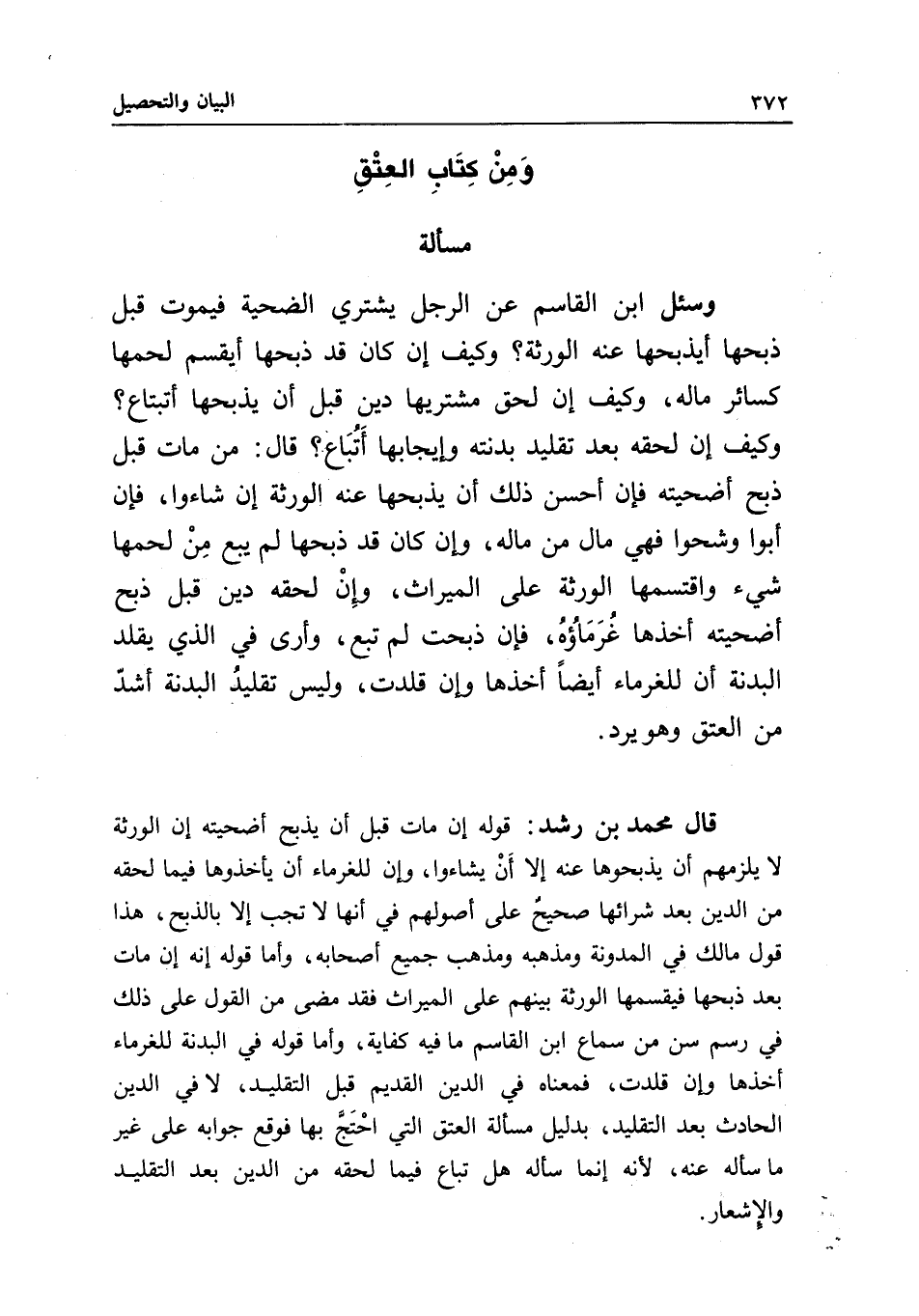 ومن كتاب العتق مسألة وسئل ابن القاسم: عن الرجل يشتري الضحية فيموت قبل ذبحها أيذبحها عنه الورثة؟ وكيف إن كان قد ذبحها أيقسم لحمها كسائر ماله، وكيف إن لحق مشتريها دين قبل أن يذبحها أتبتاع؟ وكيف إن لحقه بعد تقليد بدنته وإيجابها أتباع؟ قال: من مات قبل ذبح أضحيته فإن أحسن ذلك أن يذبحها عنه الورثة إن شاءوا، فإن أبوا وشحوا فهي مال من ماله، وإن كان قد ذبحها لم يبع من لحمها شيء واقتسمها الورثة على الميراث، وإن لحقه دين قبل ذبح أضحيته أخذها غرماؤه، فإن ذبحت لم تبع، وأرى في الذي يقلد البدنة أن للغرماء أيضا أخذها، وإن قلدت، وليس تقليد البدنة أشد من العتق وهو يرد.