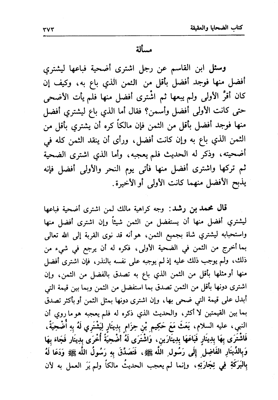 قال محمد بن رشد: وجه كراهية مالك لمن اشترى أضحية فباعها ليشتري أفضل منها أن يستفضل من الثمن شيئا، وإن اشترى أفضل منها واستحبابه ليشتري شاة بجميع الثمن، هو أنه قد نوى القربة إلى الله تعالى بما أخرج من الثمن في الضحية الأولى، فكره له أن يرجع في شيء من ذلك، ولم يوجب ذلك عليه إذ لم يوجبه على نفسه بالنذر، فإن اشترى أفضل منها أو مثلها بأقل من الثمن الذي باع به تصدق بالفضل من الثمن، وإن اشترى دونها بأقل من الثمن تصدق بما استفضل من الثمن وبما بين قيمة التي أبدل على قيمة التي ضحى بها، وإن اشترى دونها بمثل الثمن أو بأكثر تصدق بما بين القيمتين لا أكثر، والحديث الذي ذكره له فلم يعجبه هو ما روي «أن النبي، - عَلَيْهِ السَّلَامُ -، بعث مع حكيم بن حزام بدينار ليشتري له به أضحية، فاشترى بها بدينار فباعها بدينارين، واشترى له أضحية أخرى بدينار فجاء بها وبالدينار الفاضل إلى رسول الله - صَلَّى اللَّهُ عَلَيْهِ وَسَلَّمَ -، فتصدق به رسول الله - صَلَّى اللَّهُ عَلَيْهِ وَسَلَّمَ - ودعا له بالبركة في تجارته» ، وإنما لم يعجب الحديث مالكا ولم ير العمل به؛ لأن