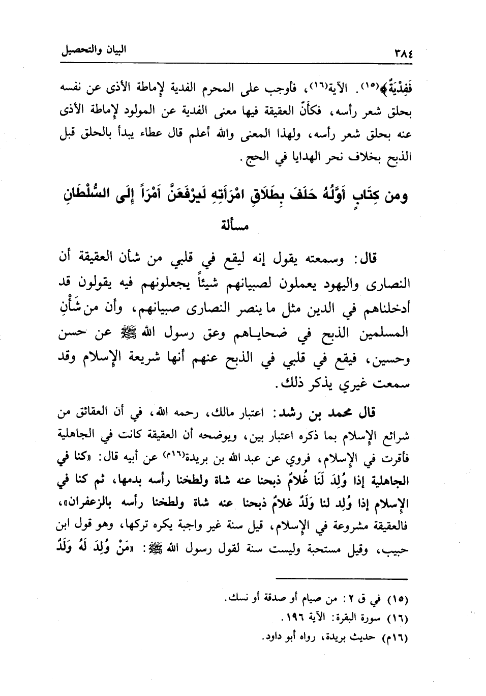 ومن كتاب أوله حلف بطلاق امرأته ليرفعن أمرا إلى السلطان مسألة قال: وسمعته يقول: إنه ليقع في قلبي من شأن العقيقة أن النصارى واليهود يعملون لصبيانهم شيئا يجعلونهم فيه يقولون قد أدخلناهم في الدين مثل ما يُنَصِّر النصارى صبيانهم، وإن من شأن المسلمين الذبح في ضحاياهم «وعق رسول الله - صَلَّى اللَّهُ عَلَيْهِ وَسَلَّمَ - عن حسن وحسين» ، فيقع في قلبي في الذبح عنهم أنها شريعة الإسلام، وقد سمعت غيري يذكر ذلك.