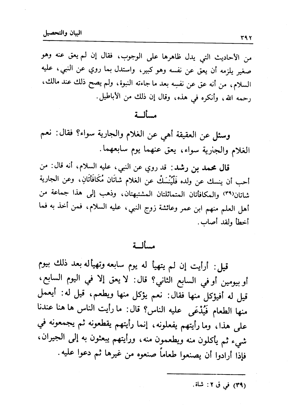 قال محمد بن رشد: قد روي عن النبي - عَلَيْهِ السَّلَامُ - أنه قال: «من أحب أن ينسك عن ولده فلينسك عن الغلام شاتان مكافأتان، وعن الجارية شاتان» ، والمكافأتان المتماثلتان المشتبهتان، وذهب إلى هذا جماعة من أهل العلم منهم ابن عمر، وعائشة زوج النبي - عَلَيْهِ السَّلَامُ -، فمن أخذ به فما أخطأ، ولقد أصاب.