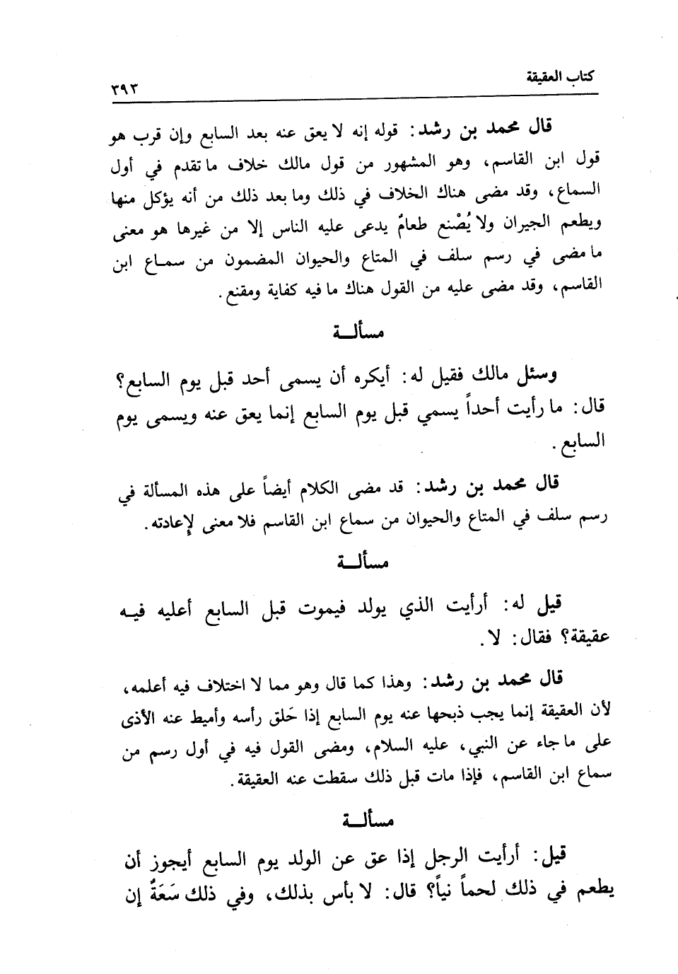 مسألة قيل له: أرأيت الذي يولد فيموت قبل السابع، أعليه فيه عقيقة؟ فقال: لا.