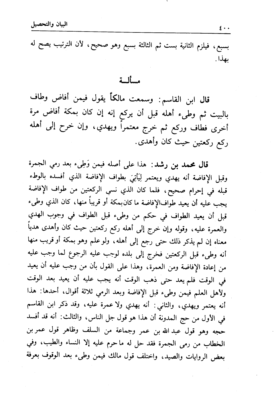 قال محمد بن رشد: هذا على أصله فيمن وطئ بعد رمي الجمرة وقبل الإفاضة، أنه يهدي ويعتمر ليأتي بطواف الإفاضة الذي أفسده بالوطء قبله في إحرام صحيح، فلما كان الذي نسي الركعتين من طواف الإفاضة يجب عليه أن يعيد طواف الإفاضة ما كان بمكة أو قريبا منها، كان الذي وطئ قبل أن يعيد الطواف في حكم من وطئ قبل الطواف في وجوب الهدي والعمرة عليه.
