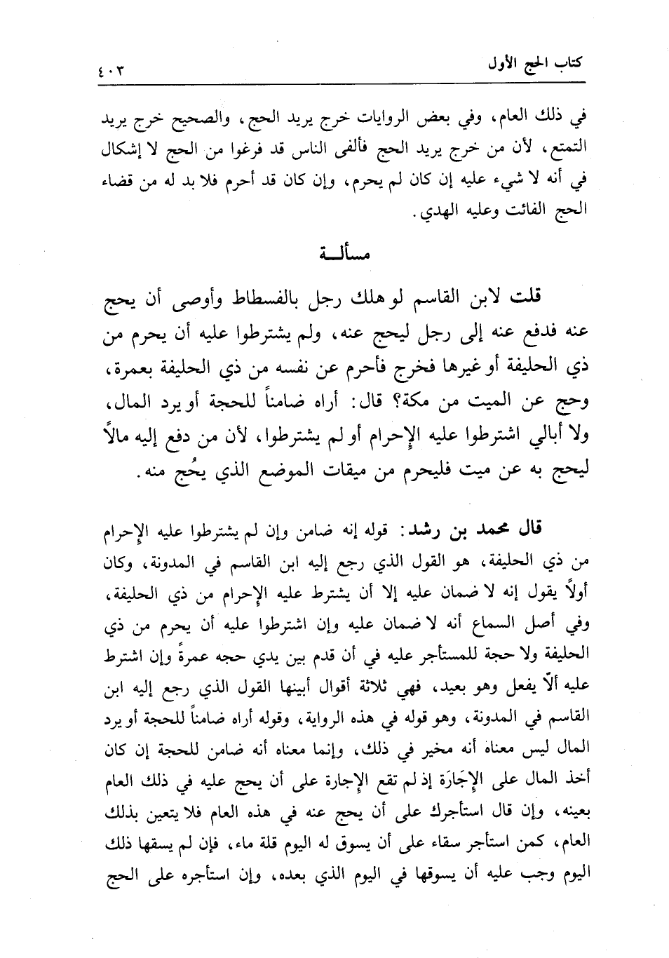 قال محمد بن رشد: قوله: إنه ضامن، وإن لم يشترطوا عليه الإحرام من ذي الحليفة، هو القول الذي رجع إليه ابن القاسم في المدونة، وكان أولا يقول: إنه لا ضمان عليه إلا أن يشترط عليه الإحرام من ذي الحليفة، وفي أصل السماع أنه لا ضمان عليه، وإن اشترطوا عليه أن يحرم من ذي الحليفة، ولا حجة للمستأجر عليه في أن قدم بين يدي حجه عمرة، وإن اشترط عليه ألا يفعل وهو بعيد، فهي ثلاثة أقوال؛ أبينها القول الذي رجع إليه ابن القاسم في المدونة، وهو قوله في هذه الرواية، وقوله أراه ضامنا للحجة أو يرد المال ليس معناه أنه مخير في ذلك، وإنما معناه أنه ضامن للحجة إن كان أخذ المال على الإجارة، إذ لم تقع الإجارة على أن يحج عليه في ذلك العام بعينه، وإن قال: استأجرك على أن يحج عنه في هذه العام، فلا يتعين بذلك العام، كمن استأجر سقاء على أن يسوق له اليوم قلة ماء، فإن لم يسقها ذلك اليوم وجب عليه أن يسوقها في اليوم الذي بعده، وإن استأجره على الحج