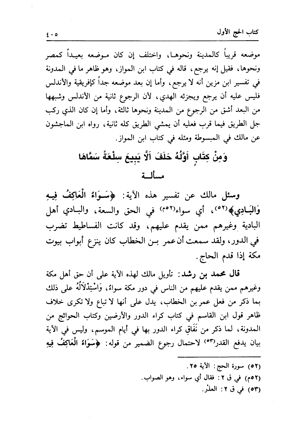 ومن كتاب أوله حلف ألا يبيع سلعة سماها مسألة وسئل مالك عن تفسير هذه الآية: {سَوَاءً الْعَاكِفُ فِيهِ وَالْبَادِ} [الحج: 25] ، أي سواء في الحق والسعة، والباقي في أهل البادية وغيرهم ممن يقدم عليهم، وقد كانت الفساطيط تضرب في الدور، ولقد سمعت أن عمر بن الخطاب كان ينزع أبواب بيوت مكة إذا قدم الحاج.