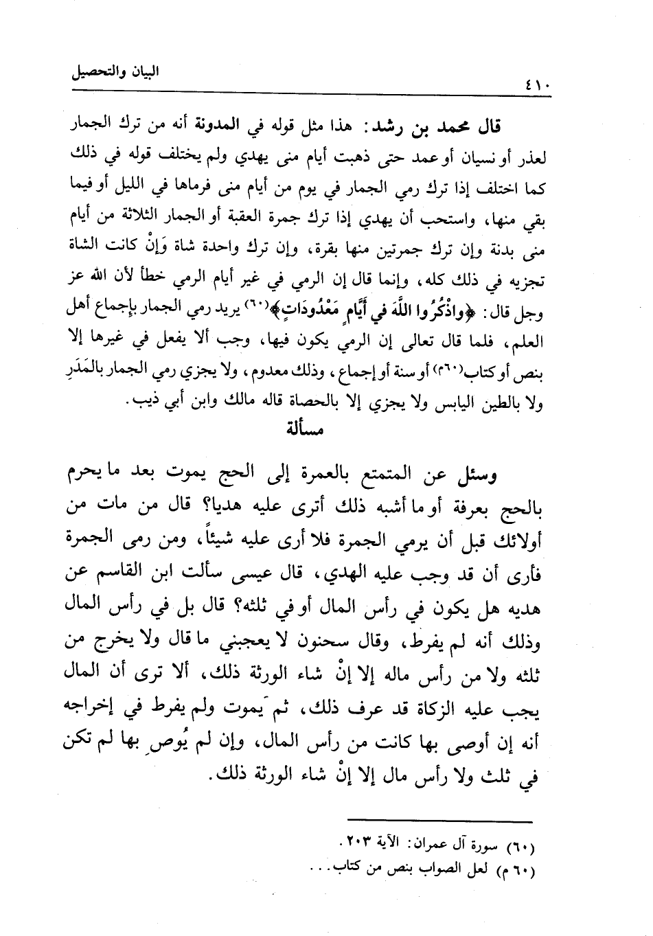 مسألة وسئل عن المتمتع بالعمرة إلى الحج، يموت بعد ما يحرم بالحج بعرفة، أو ما أشبه ذلك، أترى عليه هديا؟ قال: من مات من أولئك قبل أن يرمي الجمرة، فلا أرى عليه شيئا، ومن رمى الجمرة، فأرى أن قد وجب عليه الهدي، قال عيسى سألت ابن القاسم عن هديه هل يكون في رأس المال أو في ثلثه؟ قال: بل في رأس المال، وذلك أنه لم يفرط، وقال سحنون: لا يعجبني ما قال، ولا يخرج من ثلثه، ولا من رأس ماله إلا إن شاء الورثة ذلك، ألا ترى أن المال يجب عليه الزكاة، قد عرف ذلك، ثم يموت ولم يفرط في إخراجه أنه إن أوصى بها كانت من رأس المال، وإن لم يوص بها لم تكن في ثلث ولا رأس مال إلا إن شاء الورثة ذلك.