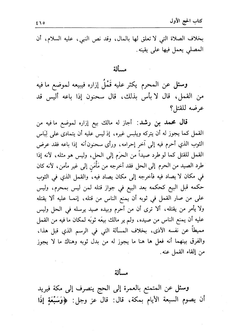 مسألة وسئل عن المحرم يكثر عليه قمل إزاره، فيبيعه لموضع ما فيه من القمل، قال: لا بأس بذلك، قال سحنون: إذا باعه أليس قد عرضه للقتل؟