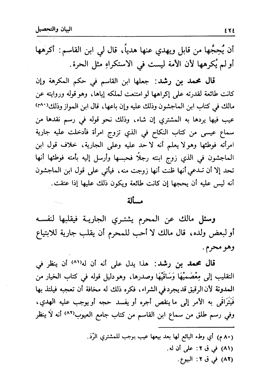 قال محمد بن رشد: جعلها ابن القاسم في حكم المكرهة، وإن كانت طائعة لقدرته على إكراهها لو امتنعت لملكه إياها، وهو قوله وروايته عن مالك في كتاب ابن الماجشون، وذلك عليه وإن باعها، قال ابن المواز: وذلك عيب فيها يردها به المشتري إن شاء، وذلك نحو قوله في رسم نقدها، من سماع عيسى، من كتاب النكاح، في الذي تزوج امرأة، فأدخلت عليه جارية امرأته فوطئها، وهو لا يعلم أنه لا حد عليه وعلى الجارية، خلاف قول ابن الماجشون في الذي زوج ابنته رجلا، فحبسها وأرسل إليه بأمته فوطئها، أنها تحد إلا أن تدعي أنها ظنت أنها زوجت منه، فيأتي على قول ابن الماجشون أنه ليس عليه أن يُحجَّها إن كانت طائعة، ويكون ذلك عليها إذا عتقت.
