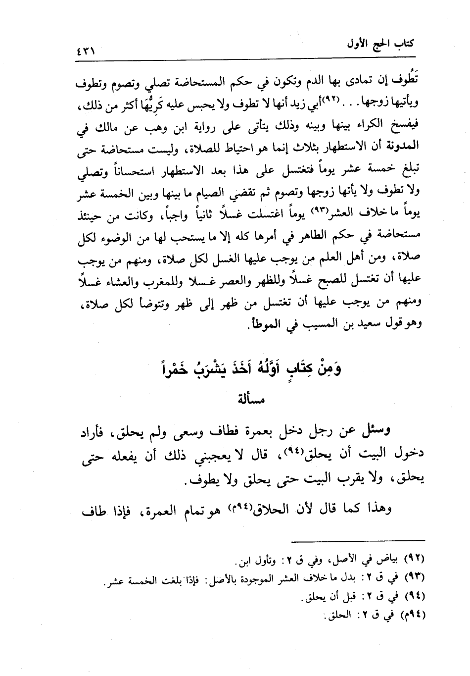 ومن كتاب أوله أخذ يشرب خمرا مسألة وسئل عن رجل دخل بعمرة، فطاف وسعى ولم يحلق، فأراد دخول البيت أن يحلق، قال: لا يعجبني ذلك أن يفعله حتى يحلق، ولا يقرب البيت حتى يحلق ولا يطوف.