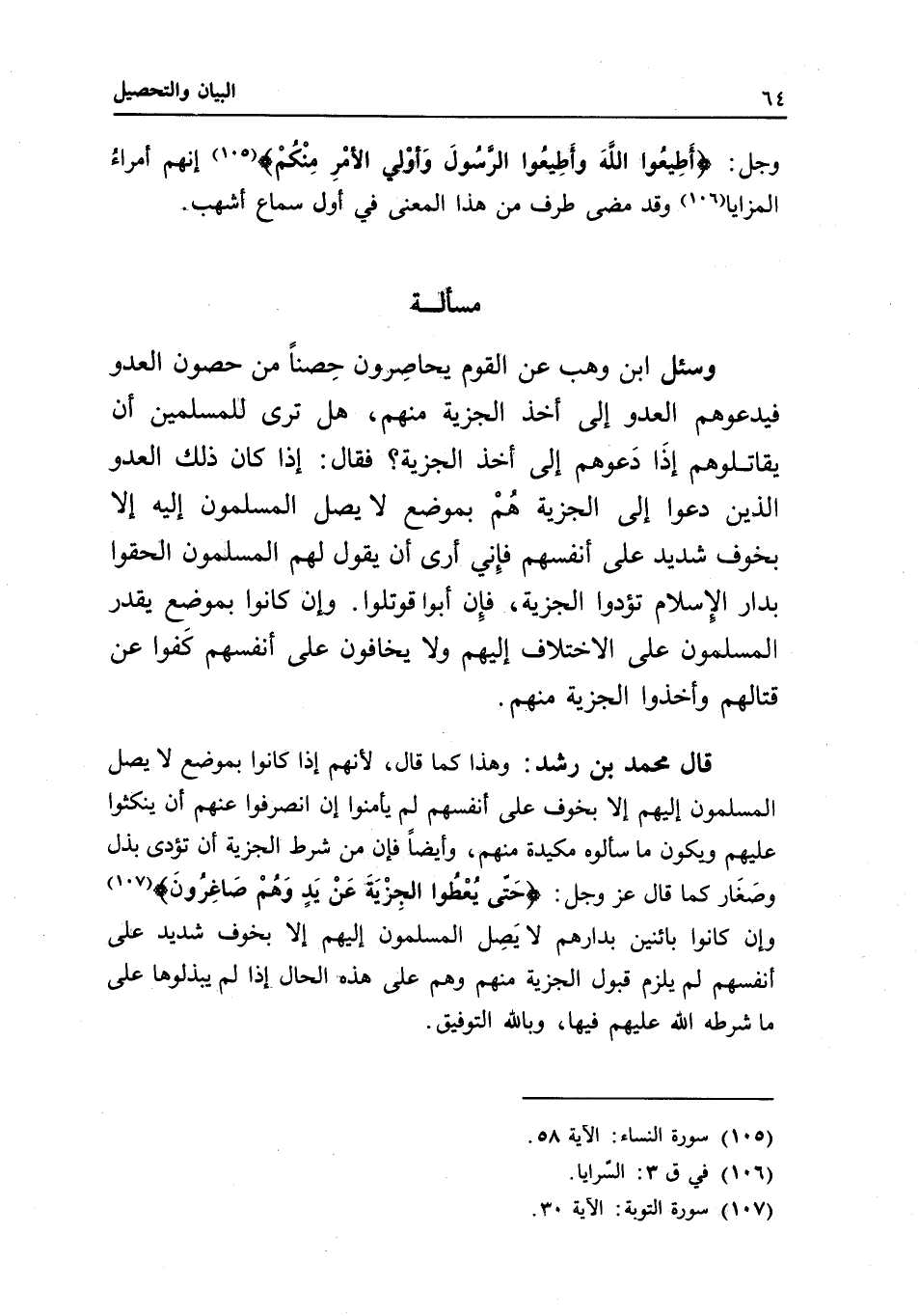 مسألة وسئل ابن وهب عن القوم يحاصرون حصنا من حصون العدو، فيدعوهم العدو إلى أخذ الجزية منهم، هل ترى للمسلمين أن يقاتلوهم إذا دعوهم إلى أخذ الجزية؟ فقال: إذا كان ذلك العدو الذين دعوا إلى الجزية هم بموضع لا يصل المسلمون إليه إلا بخوف شديد على أنفسهم، فإني أرى أن يقول لهم المسلمون: الحقوا بدار الإسلام تؤدوا الجزية، فإن أبوا قوتلوا، وإن كانوا بموضع يقدر المسلمون على الاختلاف إليهم، ولا يخافون على أنفسهم كفوا عن قتالهم، وأخذوا الجزية منهم.
