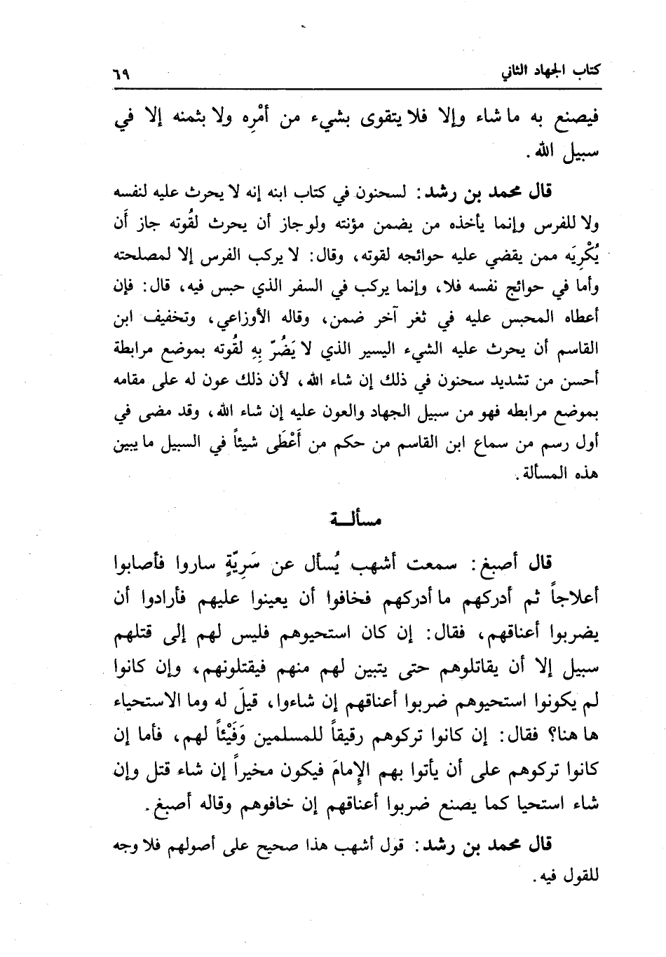 مسألة قال أصبغ: سمعت أشهب يسأل عن سريه ساروا، فأصابوا أعلاجا، ثم أدركهم ما أدركهم، فخافوا أن يعينوا عليهم، فأرادوا أن يضربوا أعناقهم، فقال: إن كان استحيوهم فليس لهم إلى قتلهم سبيل إلا أن يقاتلوهم حتى يتبين لهم منهم فيقتلونهم، وإن كانوا لم يكونوا استحيوهم ضربوا أعناقهم إن شاءوا، قيل له: وما الاستحياء هاهنا؟ فقال: إن كانوا تركوهم رقيقا للمسلمين، وفيئا لهم، فأما إن كانوا تركوهم على أن يأتوا بهم الإمام، فيكون مخيرا إن شاء قتل وإن شاء استحيا كما يصنع، ضربوا أعناقهم إن خافوهم، وقاله أصبغ.