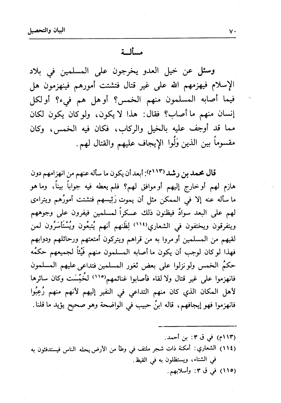 مسألة وسئل عن خيل العدو يخرجون على المسلمين في بلاد الإسلام، فيهزمهم الله على غير قتال، فتشتت أمورهم، فينهزمون، هل فيما أصابه المسلمون منهم الخمس؟ أو هل هم فيء؟ أو لكل إنسان منهم ما أصاب؟ فقال: هذا لا يكون، ولو كان يكون، لكان مما قد أوجف عليه بالخيل والركاب، فكان فيه الخمس، وكان مقسوما بين الذين ولوا الإيجاف عليهم والقتال لهم.