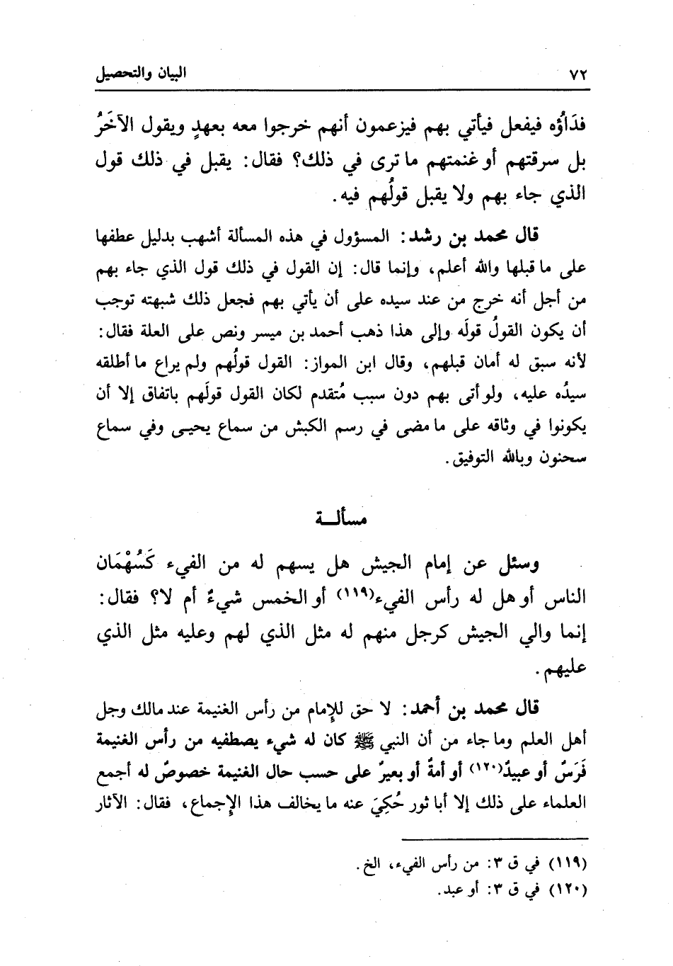 قال محمد بن أحمد: لا حق للإمام من رأس الغنيمة عند مالك وجل أهل العلم، وما جاء من أن النبي - صَلَّى اللَّهُ عَلَيْهِ وَسَلَّمَ - كان له شيء يصطفيه من رأس الغنيمة فرس أو عبيد أو أمة أو بعير، على حسب حال الغنيمة، خصوص له أجمع العلماء على ذلك، إلا أبا ثور؛ حكي عنه ما يخالف هذا الإجماع، فقال: الآثار