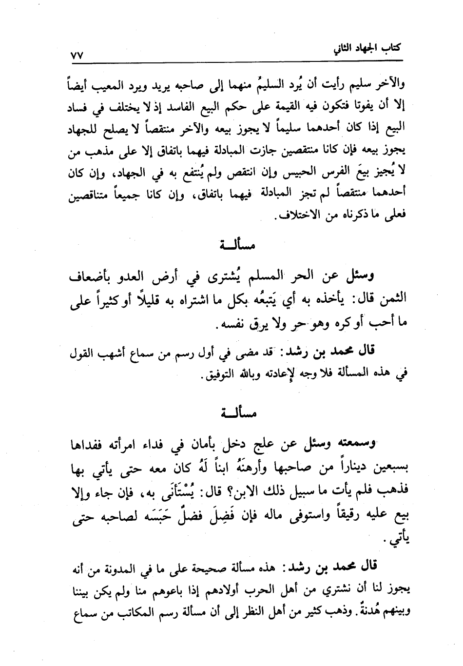مسألة وسئل عن الحر المسلم يشترى في أرض العدو بأضعاف الثمن، قال: يأخذه به أي يتبعه بكل ما اشتراه به قليلا أو كثيرا على ما أحب أو كره، وهو حر ولا يرق نفسه.