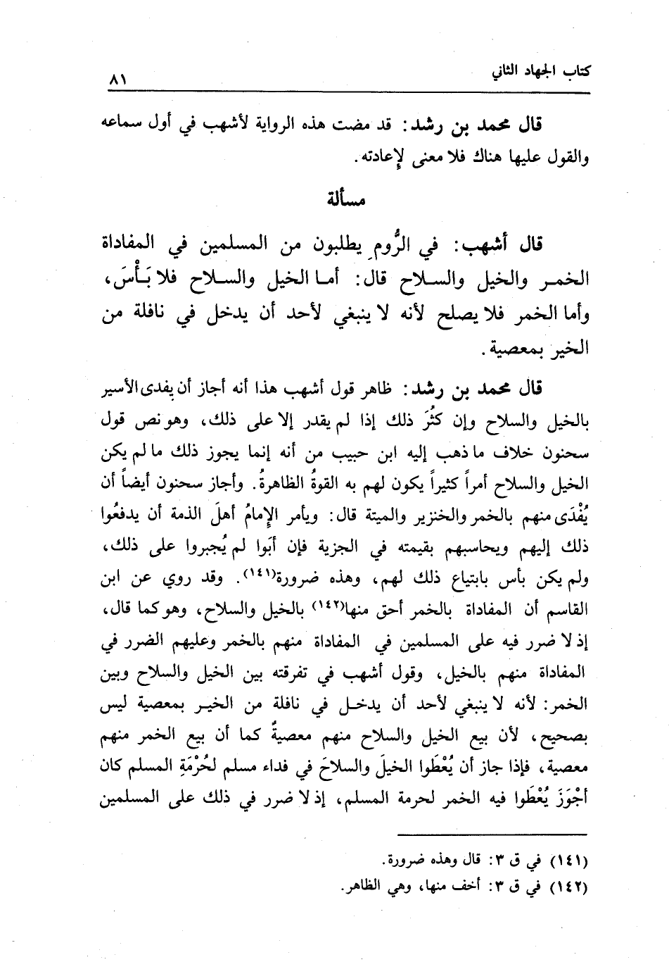 قال محمد بن رشد: ظاهر قول أشهب هذا أنه أجاز أن يفدى الأسير بالخيل والسلاح، وإن كثر ذلك، إذا لم يقدر إلا على ذلك، وهو نص قول سحنون خلاف ما ذهب إليه ابن حبيب، من أنه إنما يجوز ذلك ما لم يكن الخيل والسلاح أمرا كثيرا، يكون لهم به القوة الظاهرة.