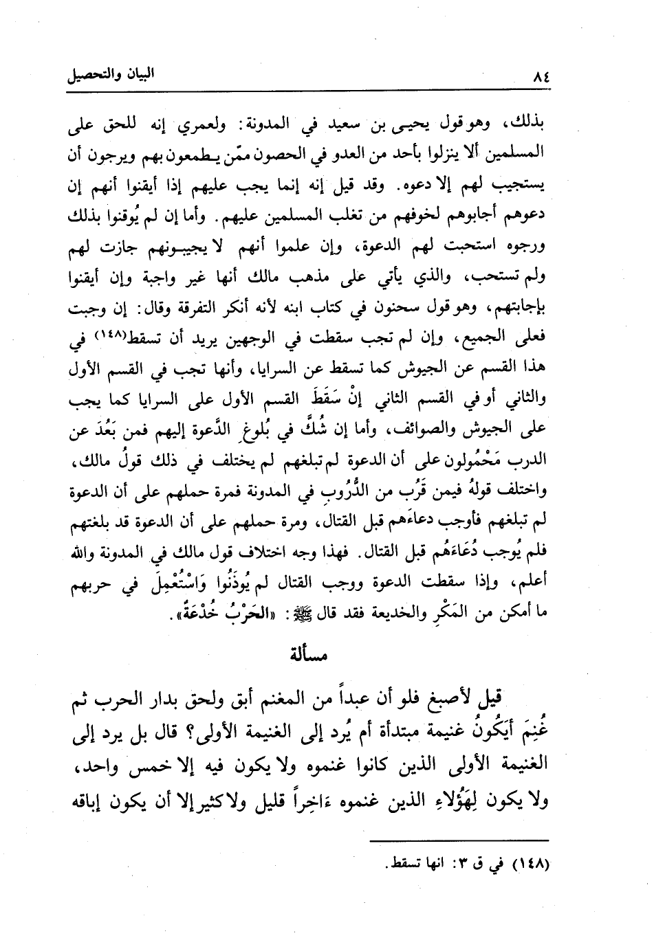 بذلك، وهو قول يحيى بن سعيد في المدونة: ولعمري إنه للحق على المسلمين ألا ينزلوا بأحد من العدو في الحصون ممن يطمعون بهم، ويرجون أن يستجيب لهم إلا دعوه. وقد قيل: إنه إنما يجب عليهم إذا أيقنوا أنهم إن دعوهم أجابوهم لخوفهم من تغلب المسلمين عليهم، وأما إن لم يوقنوا بذلك ورجوه استحبت لهم الدعوة، وإن علموا أنهم لا يجيبونهم جازت لهم ولم تستحب، والذي يأتي على مذهب مالك أنها غير واجبة، وإن أيقنوا بإجابتهم، وهو قول سحنون في كتاب ابنه؛ لأنه أنكر التفرقة وقال: إن وجبت فعلى الجميع، وإن لم تجب سقطت في الوجهين يريد أن تسقط في هذا القسم عن الجيوش كما تسقط عن السرايا، وأنها تجب في القسم الأول والثاني، أو في القسم الثاني إن سقط القسم الأول على السرايا كما يجب على الجيوش والصوائف، وأما إن شك في بلوغ الدعوة إليهم فمن بعد عن الدرب محمولون على أن الدعوة لم تبلغهم لم يختلف في ذلك قول مالك، واختلف قوله فيمن قرب من الدروب في المدونة، فمرة حملهم على أن الدعوة لم تبلغهم، فأوجب دعاءهم قبل القتال، ومرة حملهم على أن الدعوة قد بلغتهم، فلم يوجب دعاءهم قبل القتال، فهذا وجه اختلاف قول مالك في المدونة، والله أعلم، وإذا سقطت الدعوة، ووجب القتال لم يؤذنوا، واستعمل في حربهم ما أمكن من المكر والخديعة، فقد قال - صَلَّى اللَّهُ عَلَيْهِ وَسَلَّمَ -: «الحرب خدعة» .