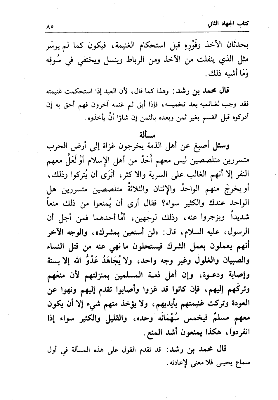 مسألة وسئل أصبغ عن أهل الذمة يخرجون غزاة إلى أرض الحرب متسررين متلصصين، ليس معهم أحد من أهل الإسلام، أو لعل معهم النفر إلا أنهم الغالب على السرية والأكثر، أترى أن يتركوا وذلك، أو يخرج منهم الواحد والاثنان والثلاثة، متلصصين متسررين، هل الواحد عندك والكثير سواء؟ فقال: أرى أن يمنعوا من ذلك منعا شديدا ويزجروا عنه، وذلك لوجهين؛ أما أحدهما: فمن أجل أن الرسول - عَلَيْهِ السَّلَامُ - قال: «لن أستعين بمشرك» ، والوجه الآخر: أنهم يعملون بعمل الشرك، فيستحلون ما نهي عنه من قتل النساء، والصبيان، والغلول، وغير وجه واحد، ولا يجاهد عدو الله إلا بسنة وإصابة ودعوة، وإن أهل ذمة المسلمين بمنزلتهم؛ لأن منعهم وتركهم إليهم، فإن كانوا قد غزوا وأصابوا تقدم إليهم ونهوا عن العودة، وتركت غنيمتهم بأيديهم، ولا يؤخذ منهم شيء إلا أن يكون معهم مسلم فيخمس سهمانه وحده، والقليل والكثير سواء إذا انفردوا، هكذا يمنعون أشد المنع.