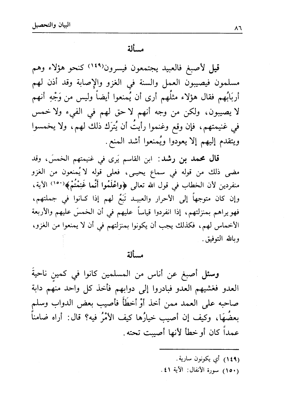 مسألة قيل لأصبغ: فالعبيد يجتمعون فيسرون كنحو هؤلاء، وهم مسلمون فيصيبون العمل والسنة في الغزو والإصابة، وقد أذن لهم أربابهم فقال: هؤلاء مثلهم أرى أن يمنعوا أيضا، وليس من وجه أنهم لا يصيبون، ولكن من وجه أنهم لا حق لهم في الفيء، ولا خمس في غنيمتهم، فإن وقع وغنموا رأيت أن يترك ذلك لهم، ولا يخمسوا ويتقدم إليهم إلا يعودوا ويمنعوا أشد المنع.
