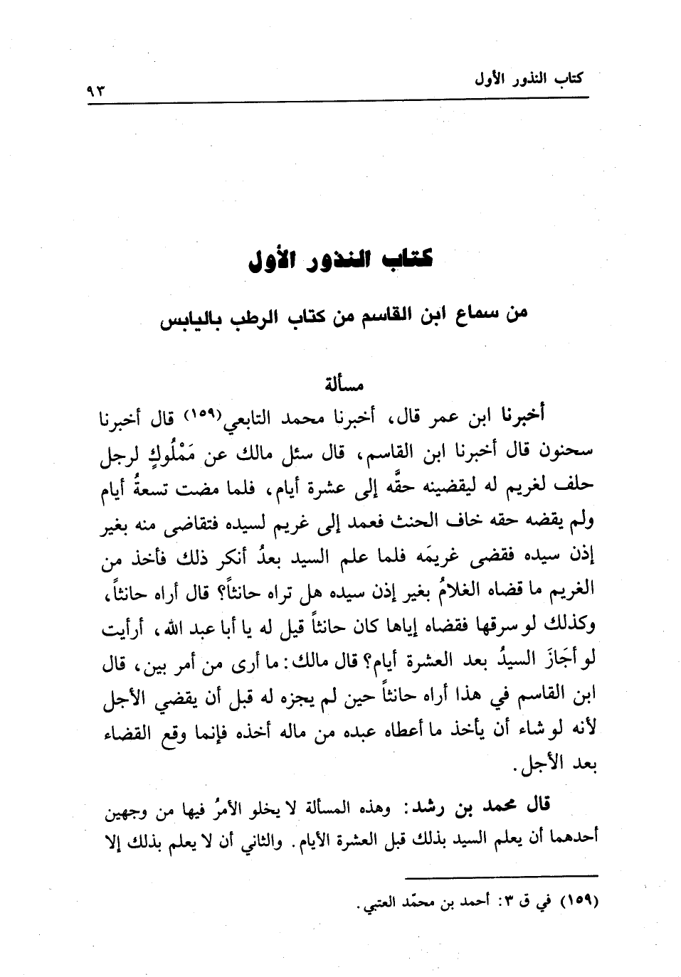 من سماع ابن القاسم من كتاب الرطب باليابس مسألة أخبرنا ابن عمر قال: أخبرنا محمد التابعي قال: أخبرنا سحنون قال: أخبرنا ابن القاسم قال: سئل مالك عن مملوك لرجل حلف لغريم له، ليقضينه حقه إلى عشرة أيام، فلما مضت تسعة أيام ولم يقضه حقه خاف الحنث، فعمد إلى غريم لسيده فتقاضى منه بغير إذن سيده، فقضى غريمه، فلما علم السيد بعد أنكر ذلك، فأخذ من الغريم ما قضاه الغلام بغير إذن سيده، هل تراه حانثا؟ قال: أراه حانثا، وكذلك لو سرقها فقضاه إياها كان حانثا، قيل له: يا أبا عبد الله، أرأيت لو أجاز السيد بعد العشرة أيام؟ قال مالك: ما أرى من أمر بين، قال ابن القاسم في هذا أراه حانثا حين لم يجزه له قبل أن يقضي الأجل لأنه لو شاء أن يأخذ ما أعطاه عبده من ماله أخذه، فإنما وقع القضاء بعد الأجل.