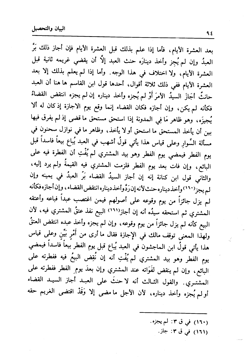 وأما إذا لم يعلم بذلك إلا بعد العشرة الأيام، ففي ذلك ثلاثة أقوال؛ أحدها: قول ابن القاسم هاهنا: أن العبد حانث، أجاز السيد الأمر أو لم يجزه، وأخذ ديناره إن لم يجزه، انتقض القضاء، فكأنه لم يكن، وإن أجازه فكان القضاء إنما وقع يوم الإجازة إذ كان له ألا يجيزه، وهو ظاهر ما في المدونة إذا استحق مستحق ما قضى، إذ لم يفرق فيها بين أن يأخذ المستحق ما استحق أو لا يأخذ، وظاهر ما في نوازل سحنون في مسألة السوار، وعلى قياس هذا يأتي قول أشهب في العبد يباع بيعا فاسدا قبل يوم الفطر، فيمضي يوم الفطر وهو بيد المشتري لم يفت أن الفطرة فيه على البائع، وإن فات بعد يوم الفطر، فلزمت المشتري فيه القيمة ولم يرد إليه. والثاني: قول ابن كنانة: إنه إن أجاز السيد القضاء بر العبد في يمينه، وإن لم يجز وأخذ ديناره حنث؛ لأنه إن رد وأخذ ديناره انتقض القضاء، وإن أجازه فكأنه لم يزل جائزا من يوم وقوعه على أصولهم فيمن اغتصب عبدا فباعه وأعتقه المشتري، ثم استحقه سيده أنه إن أجاز البيع نفذ عتق المشتري فيه؛ لأن البيع كأنه لم يزل جائزا من يوم وقوعه، وإن لم يجزه وأخذ عبده انتقض العتق، ولهذا المعنى توقف مالك في الإجازة فقال: ما أرى من أمر بين، وعلى قياس هذا يأتي قول ابن الماجشون في العبد يباع قبل يوم الفطر بيعا فاسدا، فيمضي يوم الفطر، وهو بيد المشتري لم يفت أنه إن نقض البيع فيه ففطرته على البائع، وإن لم ينقض لفواته عند المشتري، وإن بعد يوم الفطر ففطرته على المشتري.