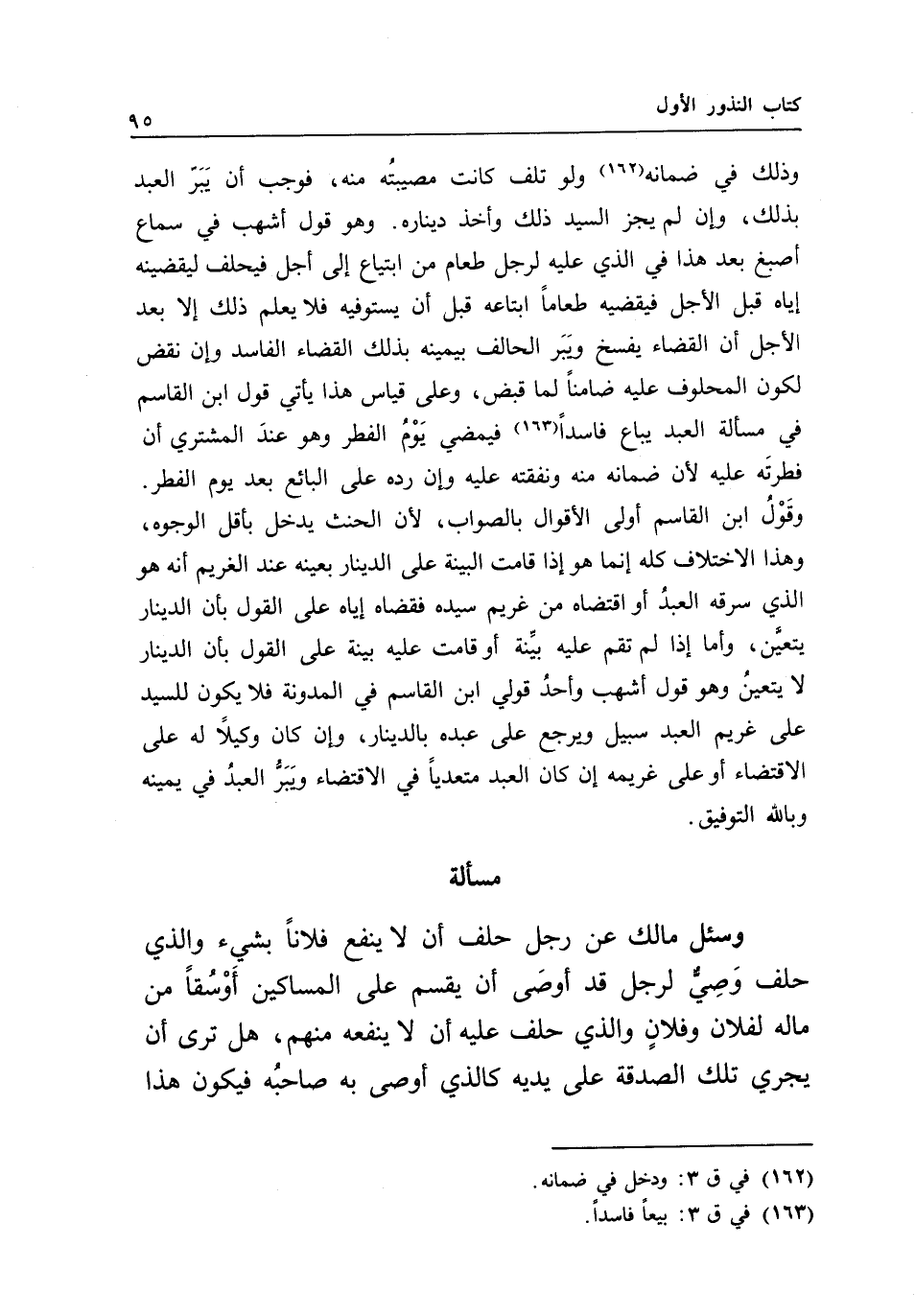 وذلك في ضمانه، ولو تلف كانت مصيبته منه، فوجب أن يبر العبد بذلك، وإن لم يجز السيد ذلك وأخذ ديناره، وهو قول أشهب في سماع أصبغ بعد هذا في الذي عليه لرجل طعام من ابتياع إلى أجل فيحلف ليقضينه إياه قبل الأجل، فيقضيه طعاما ابتاعه قبل أن يستوفيه، فلا يعلم ذلك إلا بعد الأجل أن القضاء يفسخ ويبر الحالف بيمينه بذلك القضاء الفاسد، وإن نقض لكون المحلوف عليه ضامنا لما قبض، وعلى قياس هذا يأتي قول ابن القاسم في مسألة العبد يباع فاسدا، فيمضي يوم الفطر، وهو عند المشتري أن فطرته عليه؛ لأن ضمانه منه، ونفقته عليه، وإن رده على البائع بعد يوم الفطر.