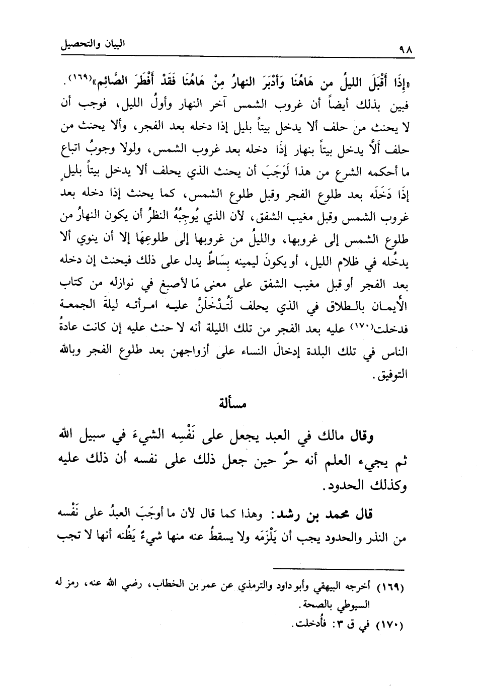 «إذا أقبل الليل من هاهنا، وأدبر النهار من هاهنا، فقد أفطر الصائم» ، فبين بذلك أيضا أن غروب الشمس آخر النهار وأول الليل، فوجب أن لا يحنث من حلف ألا يدخل بيتا بليل إذا دخله بعد الفجر، وألا يحنث من حلف ألا يدخل بيتا بنهار إذا دخله بعد غروب الشمس، ولولا وجوب اتباع ما أحكمه الشرع من هذا؛ لوجب أن يحنث الذي يحلف ألا يدخل بيتا بليل إذا دخله بعد طلوع الفجر وقبل طلوع الشمس، كما يحنث إذا دخله بعد غروب الشمس وقبل مغيب الشفق؛ لأن الذي يوجبه النظر أن يكون النهار من طلوع الشمس إلى غروبها، والليل من غروبها إلى طلوعها، إلا أن ينوي ألا يدخله في ظلام الليل، أو يكون ليمينه بساط يدل على ذلك، فيحنث إن دخله بعد الفجر أو قبل مغيب الشفق على معنى مما لأصبغ في نوازله، من كتاب الأيمان بالطلاق، في الذي يحلف: لتدخلن عليه امرأته ليلة الجمعة، فدخلت عليه بعد الفجر من تلك الليلة، أنه لا حنث عليه إن كانت عادة الناس في تلك البلدة إدخال النساء على أزواجهن بعد طلوع الفجر، وبالله التوفيق.