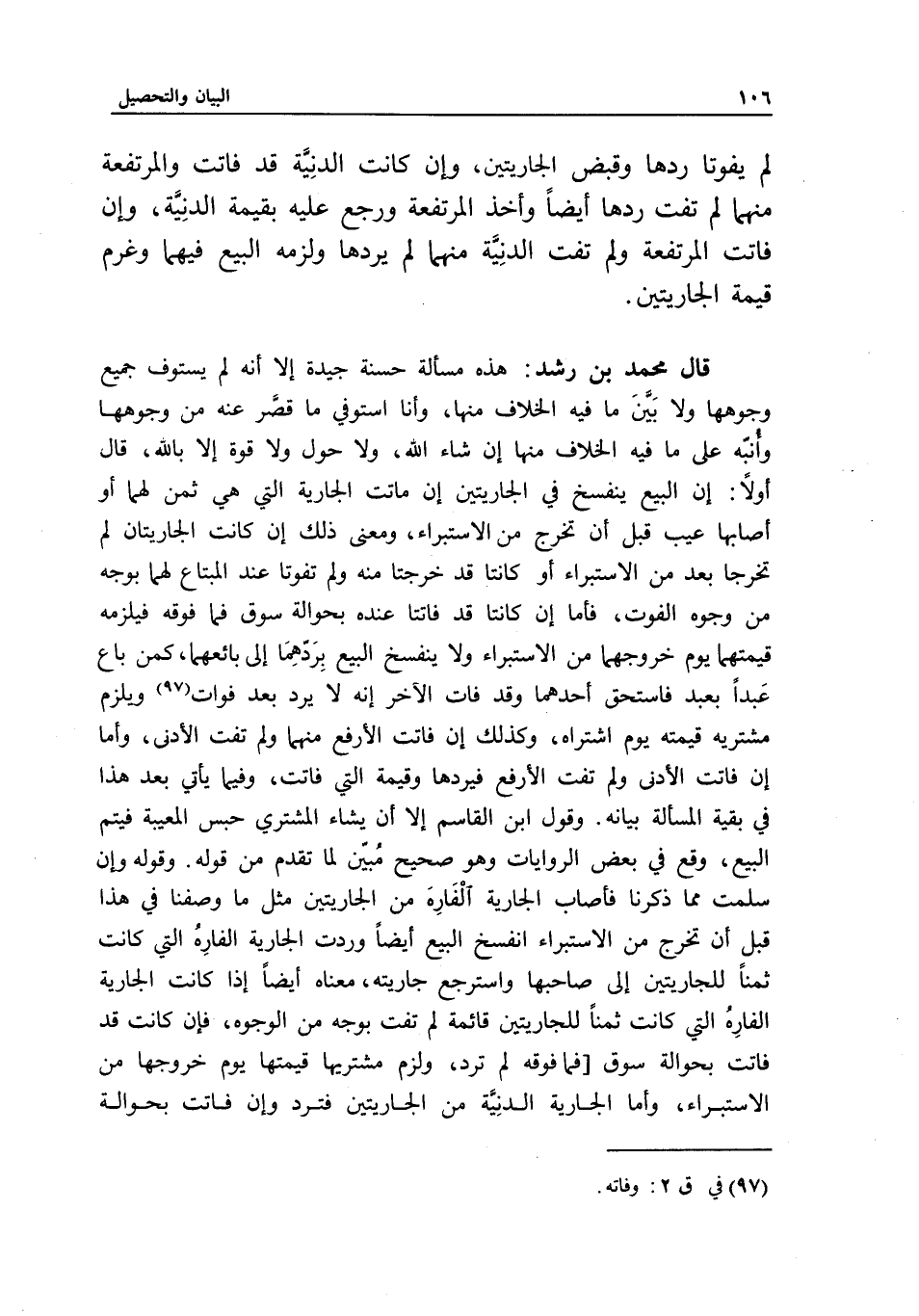 قال محمد بن رشد: هذه مسألة حسنة جيدة إلا أنه لم يستوف جميع وجوهها ولا بين ما فيه الخلاف منها، وأنا استوفي ما قصر عنه من وجوهها وأنبه على ما فيه الخلاف منها إن شاء الله، ولا حول ولا قوة إلا بالله، قال أولا: إن البيع ينفسخ في الجاريتين إن ماتت الجارية التي هي ثمن لهما أو أصابها عيب قبل أن تخرج من الاستبراء، ومعنى ذلك إن كانت الجاريتان لم تخرجا بعد من الاستبراء أو كانتا قد خرجتا منه ولم تفوتا عند المبتاع لهما بوجه من وجوه الفوت، فأما إن كانتا قد فاتتا عنده بحوالة سوق فما فوقه فيلزمه قيمتهما يوم خروجهما من الاستبراء ولا ينفسخ البيع بردهما إلى بائعهما، كمن باع عبدا بعبد، فاستحق أحدهما وقد فات الآخر: إنه لا يرد بعد فوات ويلزم مشتريه قيمته يوم اشتراه، وكذلك إن فاتت الأرفع منهما ولم تفت الأدنى، وأما إن فاتت الأدنى ولم تفت الأرفع فيردها وقيمة التي فاتت، وفيما يأتي بعد هذا في بقية المسألة بيانه. وقول ابن القاسم إلا أن يشاء المشتري حبس المعيبة فيتم البيع، وقع في بعض الروايات وهو صحيح مبين لما تقدم من قوله. وقوله وإن سلمت مما ذكرنا فأصاب الجارية الفاره من الجاريتين مثل ما وصفنا في هذا قبل أن تخرج من الاستبراء انفسخ البيع أيضا وردت الجارية الفاره التي كانت ثمنا للجاريتين إلى صاحبها واسترجع جاريته، معناه أيضا إذا كانت الجارية الفاره التي كانت ثمنا للجاريتين قائمة لم تفت بوجه من الوجوه، فإن كانت قد فاتت بحوالة سوق [فما فوقه لم ترد، ولزم مشتريها قيمتها يوم خروجها من الاستبراء، وأما الجارية الدنية من الجاريتين فترد وإن فاتت بحوالة