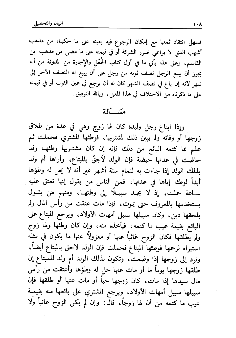 مسألة وإذا ابتاع رجل وليدة كان لها زوج وهي في عدة من طلاق زوجها أو وفاته ولم يبين ذلك لمشتريها، فوطئها المشتري فحملت ثم علم بما كتمه البائع من ذلك، فإنه إن كان مشتريها وطئها وقد حاضت في عدتها حيضة فإن الولد لاحق بالمبتاع، وأراها أم ولد بذلك الولد إذا جاءت به لتمام ستة أشهر غير أنه لا يحل له وطؤها أبدا لوطئه إياها في عدتها، فمن الناس من يقول: إنها تعتق عليه ساعة حملت، إذ لا يجد سبيلا إلى وطئها. ومنهم من يقول: يستخدمها بالمعروف حتى يموت، فإذا مات عتقت من رأس المال ولم يلحقها دين، وكان سبيلها سبيل أمهات الأولاد، ويرجع المبتاع على البائع بقيمة عيب ما كتمه، فيأخذه منه، وإن كان وطئها ولها زوج ولم يطلقها فكان الزوج غائبا عنها أو معزولا عنها ما يكون في مثله استبراء لرحمها فوطئها المبتاع فحملت، فإن الولد لاحق بالمبتاع أيضا، وترد إلى زوجها إذا وضعت، وتكون بذلك الولد أم ولد للمبتاع إن طلقها زوجها يوما ما أو مات عنها حل له وطؤها وأعتقت من رأس مال سيدها إذا مات، كان زوجها حيا أو مات عنها أو طلقها، فإن سبيلها سبيل أمهات الأولاد، ويرجع المشتري على بائعها منه بقيمة عيب ما كتمه من أن لها زوجا، قال: وإن لم يكن الزوج غائبا ولا