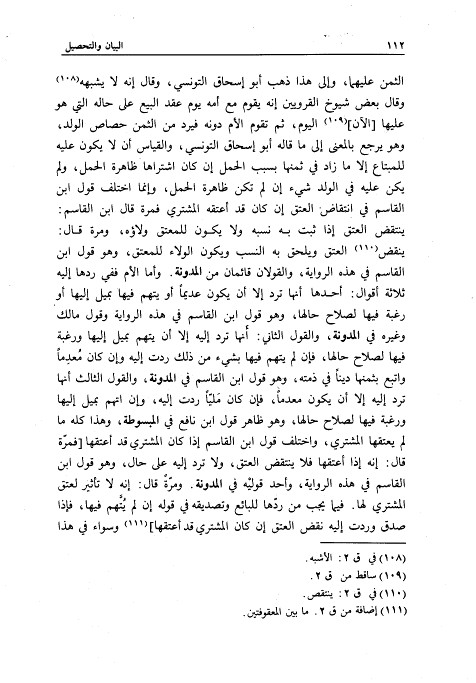 الثمن عليهما، وإلى هذا ذهب أبو إسحاق التونسي، وقال: إنه لا يشبهه. وقال بعض شيوخ القرويين: إنه يقوم مع أمه يوم عقد البيع على حاله التي هو عليها [الآن] اليوم، ثم تقوم الأم دونه، فيرد من الثمن حصاص الولد، وهو يرجع بالمعنى إلى ما قاله أبو إسحاق التونسي، والقياس أن لا يكون عليه للمبتاع إلا ما زاد في ثمنها بسبب الحمل إن كان اشتراها ظاهرة الحمل، ولم يكن عليه في الولد شيء إن لم تكن ظاهرة الحمل، وإنما اختلف قول ابن القاسم في انتقاض العتق إن كان قد أعتقه المشتري، فمرة قال ابن القاسم: ينتقض العتق إذا ثبت به نسبه ولا يكون للمعتق ولاؤه، ومرة قال: ينقض العتق ويلحق به النسب ويكون الولاء للمعتق، وهو قول ابن القاسم في هذه الرواية، والقولان قائمان من المدونة.
