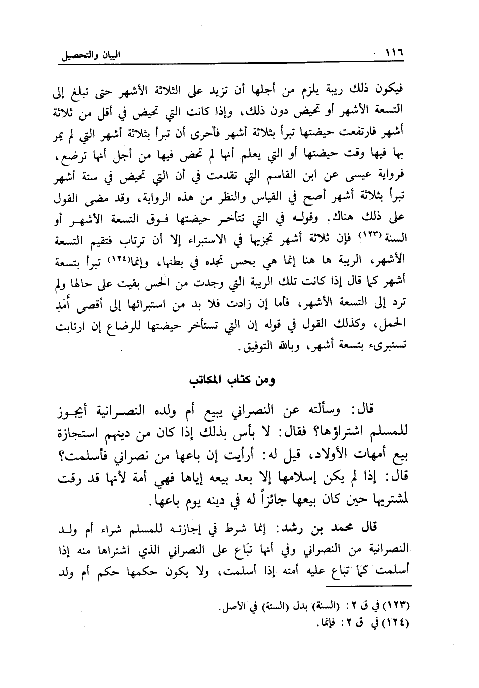 فيكون ذلك ريبة يلزم من أجلها أن تزيد على الثلاثة الأشهر حتى تبلغ إلى التسعة الأشهر أو تحيض دون ذلك، وإذا كانت التي تحيض في أقل من ثلاثة أشهر فارتفعت حيضتها تبرأ بثلاثة أشهر فأحرى أن تبرأ بثلاثة أشهر التي لم يمر بها فيها وقت حيضتها أو التي يعلم أنها لم تحض فيها من أجل أنها ترضع، فرواية عيسى عن ابن القاسم التي تقدمت في أن التي تحيض في ستة أشهر تبرأ بثلاثة أشهر أصح في القياس والنظر من هذه الرواية، وقد مضى القول على ذلك هناك. وقوله في التي تتأخر حيضتها فوق التسعة الأشهر أو السنة، فإن ثلاثة أشهر تجزيها في الاستبراء إلا أن ترتاب فتقيم التسعة الأشهر، الريبة هاهنا إنما هي بحس تجده في بطنها، وإنما تبرأ بتسعة أشهر كما قال إذا كانت تلك الريبة التي وجدت من الحس بقيت على حالها ولم ترد إلى التسعة الأشهر، فأما إن زادت فلا بد من استبرائها إلى أقصى أمد الحمل، وكذلك القول في قوله: إن التي تستأخر حيضتها للرضاع إن ارتابت تستبرئ بتسعة أشهر، وبالله التوفيق.