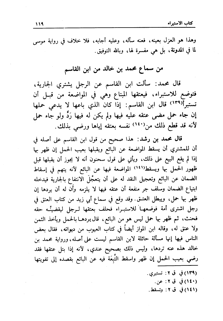 وقد وقع في سماع أبي زيد من كتاب العتق في رجل اشترى أمة فوضعها للاستبراء فحلف بعتقها لرجل ليقضينه حقه فحنث، ثم ظهر بها حمل ليس هو من البائع، قال: يردها بالحمل ويأخذ الثمن ولا عتق له، وقاله ابن المواز أيضا في كتاب العيوب من ديوانه، فقال بعض الناس فيها: إنها مسألة حائلة لابن القاسم ليست على أصله، ورواية محمد بن خالد هذه عنه تردها، وليس ذلك بصحيح عندي؛ لأنه إذا بتل عتقها فقد رضي بعيب الحمل إن ظهر، وأسقط التبعة فيه عن البائع بقصده إلى تفويتها