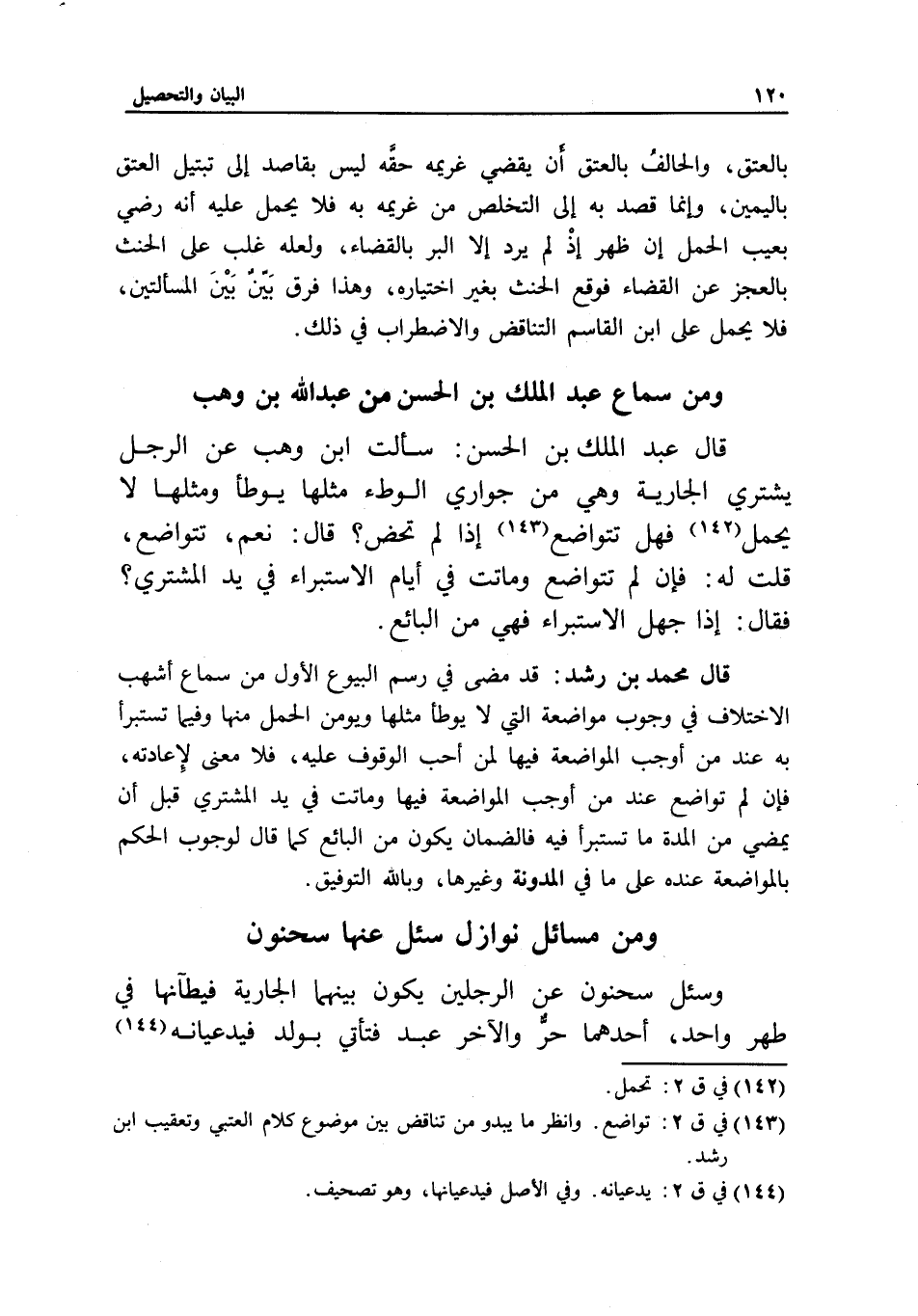 ومن مسائل نوازل سئل عنها سحنون وسئل سحنون: عن الرجلين يكون بينهما الجارية فيطآنها في طهر واحد، أحدهما حر والآخر عبد، فتأتي بولد فيدعيانه