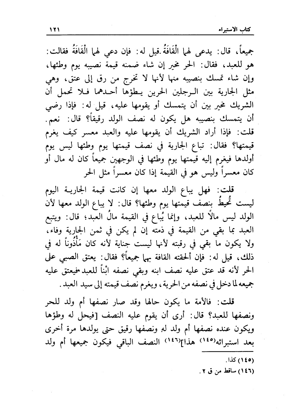 جميعا، قال: يدعى لهما القافة. قيل له: فإن دعي لهما القافة فقالت: هو للعبد، فقال: الحر مخير إن شاء ضمنه قيمة نصيبه يوم وطئها، وإن شاء تمسك بنصيبه منها؛ لأنها لا تخرج من رق إلى عتق، وهي مثل الجارية بين الرجلين الحرين يطؤها أحدهما فلا تحمل - أن الشريك مخير بين أن يتمسك أو يقومها عليه، قيل له: فإذا رضي أن يتمسك بنصيبه هل يكون له نصف الولد رقيقا؟ قال: نعم. قلت: فإذا أراد الشريك أن يقومها عليه والعبد معسر، كيف يغرم قيمتها؟ فقال: تباع الجارية في نصف قيمتها يوم وطئها ليس يوم أولدها فيغرم إليه قيمتها يوم وطئها في الوجهين جميعا كان له مال أو كان معسرا وليس هو في القيمة إذا كان معسرا مثل الحر.