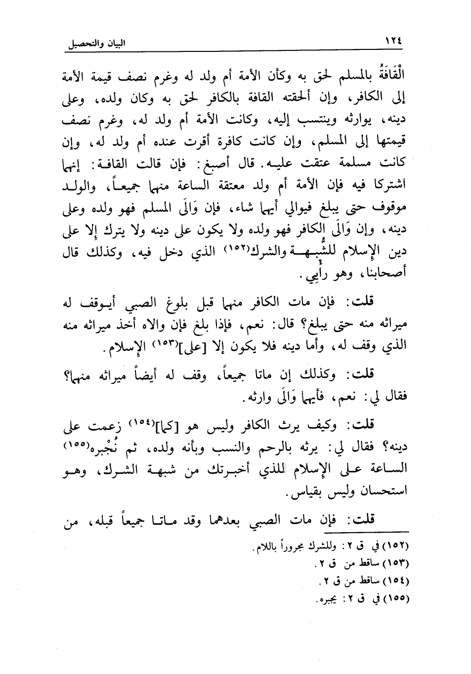 القافة بالمسلم لحق به وكأن الأمة أم ولد له وغرم نصف قيمة الأمة إلى الكافر، وإن ألحقته القافة بالكافر لحق به وكان ولده، وعلى دينه، يوارثه وينتسب إليه، وكانت الأمة أم ولد له، وغرم نصف قيمتها إلى المسلم، وإن كانت كافرة أقرت عنده أم ولد له، وإن كانت مسلمة عتقت عليه. قال أصبغ: فإن قالت القافة: إنهما اشتركا فيه فإن الأمة أم ولد معتقة الساعة منهما جميعا، والولد موقوف حتى يبلغ فيوالي أيهما شاء، فإن والى المسلم فهو ولده وعلى دينه، وإن والى الكافر فهو ولده ولا يكون على دينه ولا يترك إلا على دين الإسلام للشبهة والشرك الذي دخل فيه، وكذلك قال أصحابنا، وهو رأيي.