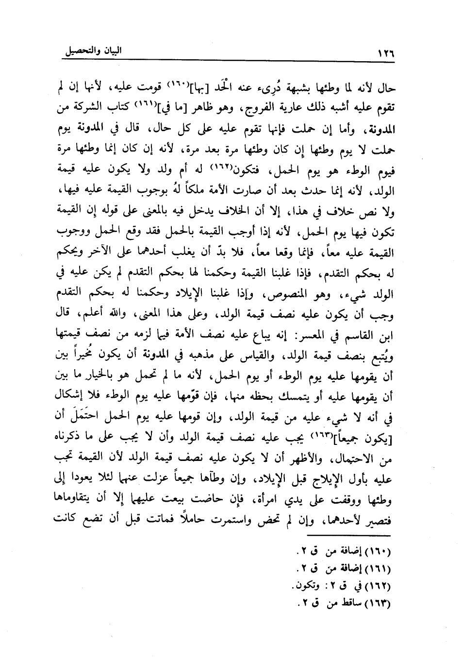 حال لأنه لما وطئها بشبهة درئ عنه الحد [بها] قُوِّمَتْ عليه؛ لأنها إن لم تُقَوَّم عليه أشبه ذلك عارية الفروج، وهو ظاهر ما في كتاب الشركة من المدونة، وأما إن حملت فإنها تُقَوَّم عليه على كل حال، قال في المدونة: يوم حملت لا يوم وطئها إن كان وطئها مرة بعد مرة؛ لأنه إن كان إنما وطئها مرة فيوم الوطء هو يوم الحمل، فتكون له أم ولد، ولا يكون عليه قيمة الولد؛ لأنه إنما حدث بعد أن صارت الأمة ملكا له بوجوب القيمة عليه فيها، ولا نص خلاف في هذا، إلا أن الخلاف يدخل فيه بالمعنى على قوله: إن القيمة تكون فيها يوم الحمل؛ لأنه إذا أوجب القيمة بالحمل فقد وقع الحمل ووجوب القيمة عليه معا، فإنما وقعا معا، فلا بد أن يغلب أحدهما على الآخر ويحكم له بحكم التقدم، فإذا غلبنا القيمة وحكمنا لها بحكم التقدم لم يكن عليه في الولد شيء، وهو المنصوص، وإذا غلبنا الإيلاد وحكمنا له بحكم التقدم وجب أن يكون عليه نصف قيمة الولد، وعلى هذا المعنى والله أعلم، قال ابن القاسم في المعسر: إنه يباع عليه نصف الأمة فيما لزمه من نصف قيمتها ويتبع بنصف قيمة الولد، والقياس على مذهبه في المدونة أن يكون مخيرا بين أن يقومها عليه يوم الوطء أو يوم الحمل؛ لأنه ما لم تحمل، هو بالخيار ما بين أن يقومها عليه أو يتمسك بحظه منها، فإن قومها عليه يوم الوطء فلا إشكال في أنه لا شيء عليه من قيمة الولد، وإن قومها عليه يوم الحمل احتمل أن [يكون جميعا] يجب عليه نصف قيمة الولد وأن لا يجب على ما ذكرناه من الاحتمال، والأظهر أن لا يكون عليه نصف قيمة الولد؛ لأن القيمة تجب عليه بأول الإيلاج قبل الإيلاد، وإن وطآها جميعا عزلت عنهما لئلا يعودا إلى وطئها ووقفت على يدي امرأة، فإن حاضت بيعت عليهما إلا أن يتقاوماها فتصير لأحدهما، وإن لم تحض واستمرت حاملا فماتت قبل أن تضع كانت