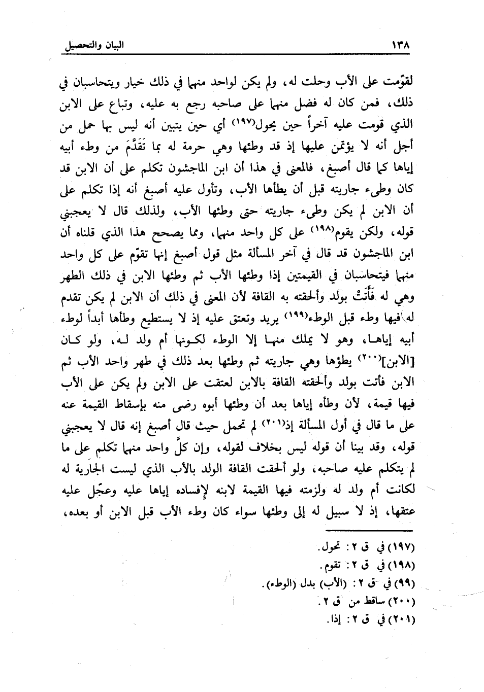 لقومت على الأب وحلت له، ولم يكن لواحد منهما في ذلك خيار، ويتحاسبان في ذلك، فمن كان له فضل منهما على صاحبه رجع به عليه، وتباع على الابن الذي قومت عليه آخرا حين يحول أي حين يتبين أنه ليس بها حمل من أجل أنه لا يؤتمن عليها إذ قد وطئها، وهي حرمة له بما تقدم من وطء أبيه إياها كما قال أصبغ، فالمعنى في هذا أن ابن الماجشون تكلم على أن الابن قد كان وطئ جاريته قبل أن يطأها الأب، وتأول عليه أصبغ: أنه إذا تكلم على أن الابن لم يكن وطئ جاريته حتى وطئها الأب، ولذلك قال لا يعجبني قوله، ولكن يقوم على كل واحد منهما، ومما يصحح هذا الذي قلناه: أن ابن الماجشون قد قال في آخر المسألة مثل قول أصبغ إنها تقوم على كل واحد منهما، فيتحاسبان في القيمتين إذا وطئها الأب، ثم وطئها الابن في ذلك الطهر وهي له فاتت بولد وألحقته به القافة؛ لأن المعنى في ذلك أن الابن لم يكن تقدم له فيها وطء قبل الوطء يريد، وتعتق عليه إذ لا يستطيع وطأها أبدا لوطء أبيه إياها، وهو لا يملك منها إلا الوطء؛ لكونها أم ولد له، ولو كان [الابن] يطؤها وهي جاريته، ثم وطئها بعد ذلك في طهر واحد الأب، ثم الابن فأتت بولد وألحقته القافة بالابن لعتقت على الابن، ولم يكن على الأب فيها قيمة؛ لأن وطأه إياها بعد أن وطئها أبوه رضي منه بإسقاط القيمة عنه على ما قال في أول المسألة إذ لم تحمل حيث قال أصبغ: إنه قال: لا يعجبني قوله، وقد بينا أن قوله ليس بخلاف لقوله، وإن كل واحد منهما تكلم على ما لم يتكلم عليه صاحبه، ولو ألحقت القافة الولد بالأب الذي ليست الجارية له لكانت أم ولد له ولزمته فيها القيمة لابنه؛ لإفساده إياها عليه وعجل عليه عتقها، إذ لا سبيل له إلى وطئها سواء كان وطء الأب قبل الابن أو بعده،