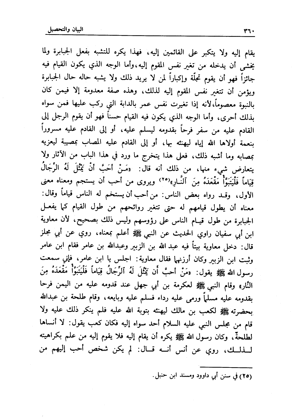 يقام إليه ولا يتكبر على القائمين إليه، فهذا يكره للتشبه بفعل الجبابرة ولما يخشى أن يدخله من تغير نفس المقوم إليه، وأما الوجه الذي يكون القيام فيه جائزا فهو أن يقوم تجلة وإكبارا لمن لا يريد ذلك ولا يشبه حاله حال الجبابرة ويؤمن أن تتغير نفس المقوم إليه لذلك، وهذه صفة معدومة إلا فيمن كان بالنبوة معصوما، لأنه إذا تغيرت نفس عمر بالدابة التي ركب عليها، فمن سواه بذلك أحرى، وأما الوجه الذي يكون فيه القيام حسنا فهو أن يقوم الرجل إلى القادم عليه من سفر فرحا بقدومه ليسلم عليه، أو إلى القادم عليه مسرورا بنعمة أولاها الله إياه ليهنئه بها، أو إلى القادم عليه المصاب بمصيبة ليعزيه بمصابه وما أشبه ذلك، فعلى هذا يتخرج ما ورد في هذا الباب من الآثار ولا يتعارض شيء منها، من ذلك أنه قال: «من أحب أن يمثل له الرجال قياما فليتبوأ مقعده من النار ويروى: من أحب أن يستجم» ، ومعناه معنى الأول، وقد رواه بعض الناس: «من أحب أن يستخم له الناس قياما» ، وقال: معناه أن يطول قيامهم له حتى تتغير روائحهم من طول القيام كما يفعل الجبابرة من طول قيام الناس على رؤوسهم، وليس ذلك بصحيح، لأن معاوية بن أبي سفيان راوي الحديث عن النبي - صَلَّى اللَّهُ عَلَيْهِ وَسَلَّمَ - أعلم بمعناه، روي «عن أبي مجلز قال: دخل معاوية بيتا فيه عبد الله بن الزبير وعبد الله بن عامر، فقام ابن عامر وثبت ابن الزبير وكان أرزنهما فقال معاوية: اجلس يا ابن عامر، فإني سمعت رسول الله - صَلَّى اللَّهُ عَلَيْهِ وَسَلَّمَ - يقول: من أحب أن يمثل له الرجال قياما فليتبوأ مقعده من النار» وقام النبي - صَلَّى اللَّهُ عَلَيْهِ وَسَلَّمَ - لعكرمة بن أبي جهل عند قدومه عليه من اليمن فرحا بقدومه عليه مسلما، ورمى عليه رداء فسلم عليه وبايعه، وقام طلحة بن عبد الله بحضرته - صَلَّى اللَّهُ عَلَيْهِ وَسَلَّمَ - لكعب بن مالك ليهنئه بتوبة الله عليه، فلم ينكر ذلك عليه ولا قام من مجلس النبي - عَلَيْهِ السَّلَامُ - أحد سواه إليه، فكان كعب يقول: لا أنساها لطلحة، وكان رسول الله - صَلَّى اللَّهُ عَلَيْهِ وَسَلَّمَ - يكره أن يقام إليه فلا يقوم إليه من علم بكراهيته لذلك، روي «عن أنس أنه قال: لم يكن شخص أحب إليهم من