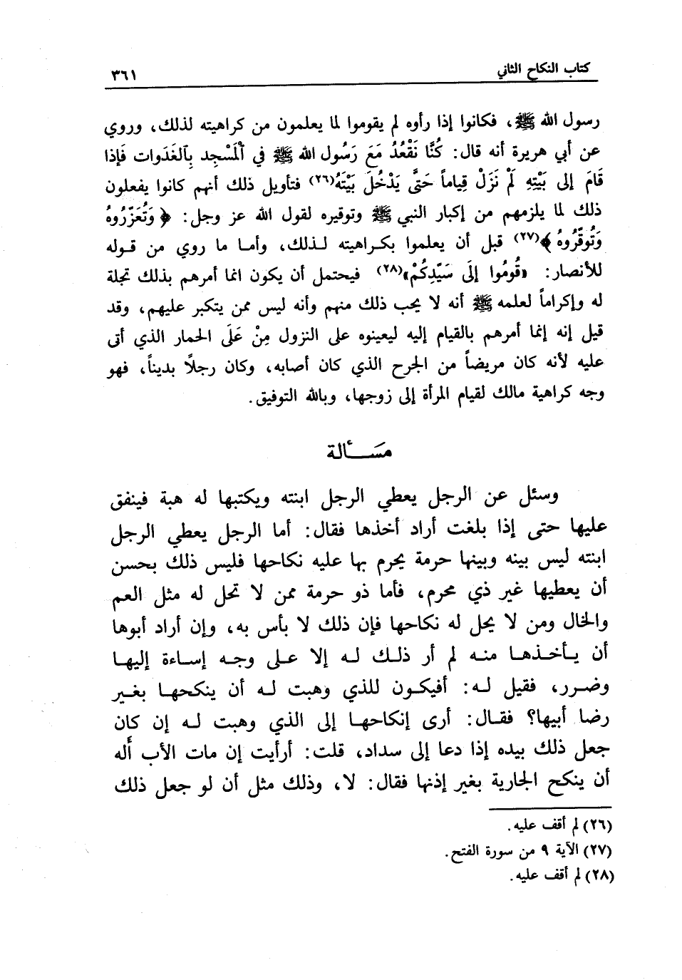 رسول الله - صَلَّى اللَّهُ عَلَيْهِ وَسَلَّمَ -، فكانوا إذا رأوه لم يقوموا لما يعلمون من كراهيته لذلك» وروي عن أبي هريرة أنه قال: «كنا نقعد مع رسول الله - صَلَّى اللَّهُ عَلَيْهِ وَسَلَّمَ - في المسجد بالغدوات فإذا قام إلى بيته لم نزل قياما حتى يدخل بيته» ، فتأويل ذلك أنهم كانوا يفعلون ذلك لما يلزمهم من إكبار النبي - صَلَّى اللَّهُ عَلَيْهِ وَسَلَّمَ - وتوقيره لقول الله عز وجل: {وَتُعَزِّرُوهُ وَتُوَقِّرُوهُ} [الفتح: 9] قبل أن يعلموا بكراهيته لذلك، وأما ما روي من «قوله للأنصار: قوموا إلى سيدكم» فيحتمل أن يكون إنما أمرهم بذلك تجلة له وإكراما لعلمه - صَلَّى اللَّهُ عَلَيْهِ وَسَلَّمَ - أنه لا يحب ذلك منهم، وأنه ليس ممن يتكبر عليهم، وقد قيل: إنه إنما أمرهم بالقيام إليه ليعينوه على النزول من على الحمار الذي أتى عليه لأنه كان مريضا من الجرح الذي كان أصابه، وكان رجلا بدينا، فهو وجه كراهية مالك لقيام المرأة إلى زوجها، وبالله التوفيق.