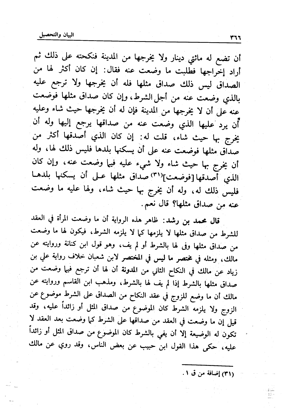 قال محمد بن رشد: ظاهر هذه الرواية أن ما وضعت المرأة في العقد للشرط من صداق مثلها لا يلزمها كما لا يلزمه الشرط، فيكون لها ما وضعت من صداق مثلها وفى لها بالشرط أو لم يف، وهو قول ابن كنانة وروايته عن مالك، ومثله في مختصر ما ليس في المختصر لابن شعبان خلاف رواية علي بن زياد عن مالك في النكاح الثاني من المدونة أن لها أن ترجع فيما وضعت من صداق مثلها بالشرط إذا لم يف لها بالشرط، ومذهب ابن القاسم وروايته عن مالك أن ما وضع للزوج في عقد النكاح من الصداق على الشرط موضوع عن الزوج، ولا يلزمه الشرط، كان الموضوع من صداق المثل أو زائدا عليه، وقد قيل: إن ما وضعت في العقد من صداقها على الشرط كما وضعت بعد العقد لا تكون له الوضيعة إلا أن يفي بالشرط كان الموضوع من صداق المثل أو زائدا عليه، حكى هذا القول ابن حبيب عن بعض الناس، وقد روي عن مالك