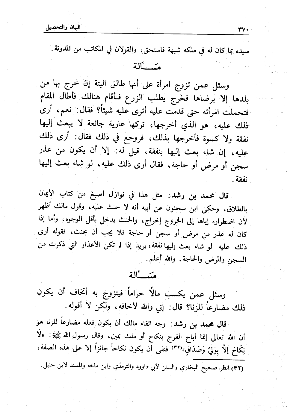 قال محمد بن رشد: وجه اتقاء مالك أن يكون فعله مضارعا للزنا هو أن الله تعالى إنما أباح الفرج بنكاح أو ملك يمين، وقال رسول الله - صَلَّى اللَّهُ عَلَيْهِ وَسَلَّمَ -. «لا نكاح إلا بولي وصداق» فنفى أن يكون نكاحا جائزا إلا على هذه الصفة،