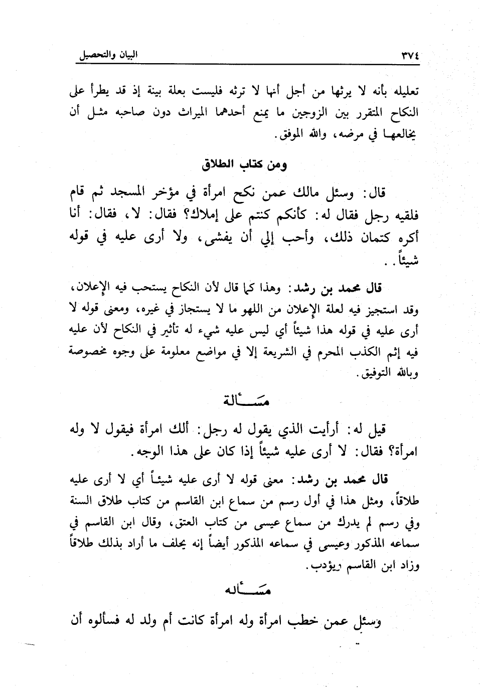 ومن كتاب الطلاق قال: وسئل مالك عمن نكح امرأة في مؤخر المسجد ثم قام فلقيه رجل فقال له: كأنكم كنتم على إملاك؟ فقال: لا، فقال: أنا أكره كتمان ذلك، وأحب إلي أن يفشى، ولا أرى عليه في قوله شيئا.