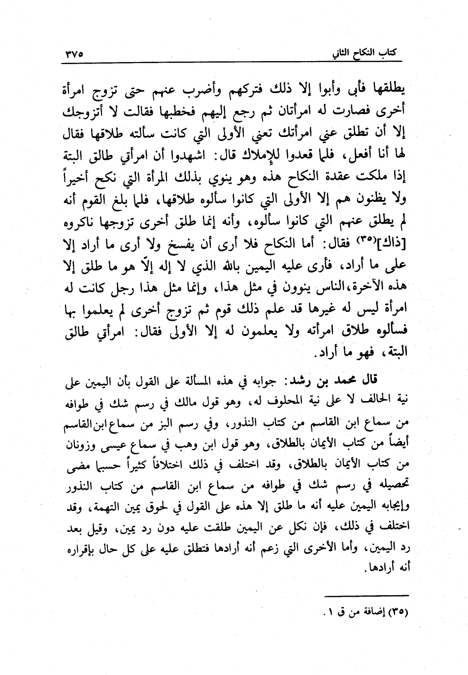 يطلقها فأبى، وأبوا إلا ذلك، فتركهم وأضرب عنهم حتى تزوج امرأة أخرى فصارت له امرأتان، ثم رجع إليهم فخطبها فقالت: لا أتزوجك إلا أن تطلق عني امرأتك، تعني الأولى التي كانت سألته طلاقها، فقال لها: أنا أفعل، فلما قعدوا للإملاك قال: اشهدوا أن امرأتي طالق البتة، إذا ملكت عقدة النكاح هذه، وهو ينوي بذلك المرأة التي نكح أخيرا، ولا يظنون هم إلا الأولى التي كانوا سألوه طلاقها، فلما بلغ القوم أنه لم يطلق عنهم التي كانوا سألوه، وأنه إنما طلق أخرى تزوجها، ناكروه [ذاك] فقال: أما النكاح فلا أرى أن يفسخ ولا أرى ما أراد إلا على ما أراد، فأرى عليه اليمين بالله الذي لا إله إلا هو ما طلق إلا هذه الآخرة، الناس ينوون في مثل هذا، وإنما مثل هذا رجل كانت له امرأة ليس له غيرها، قد علم ذلك قوم، ثم تزوج أخرى لم يعلموا بها فسألوه طلاق امرأته ولا يعلمون له إلا الأولى فقال: امرأتي طالق البتة، فهو ما أراد.