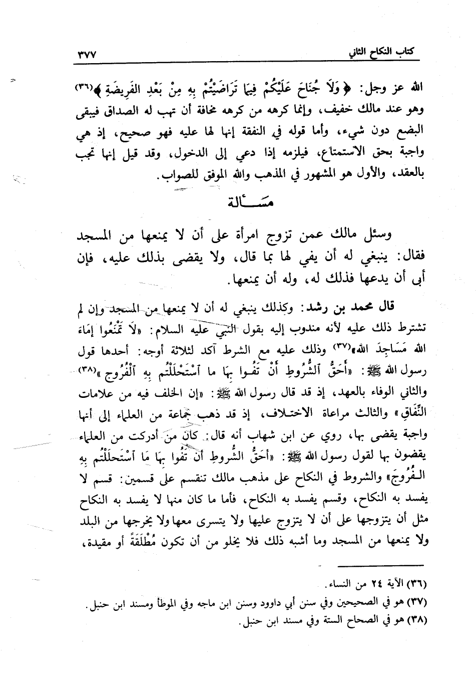 مسألة وسئل مالك عمن تزوج امرأة على أن لا يمنعها من المسجد، فقال: ينبغي له أن يفي لها بما قال، ولا يقضى بذلك عليه، فإن أبى أن يدعها فذلك له، وله أن يمنعها.
