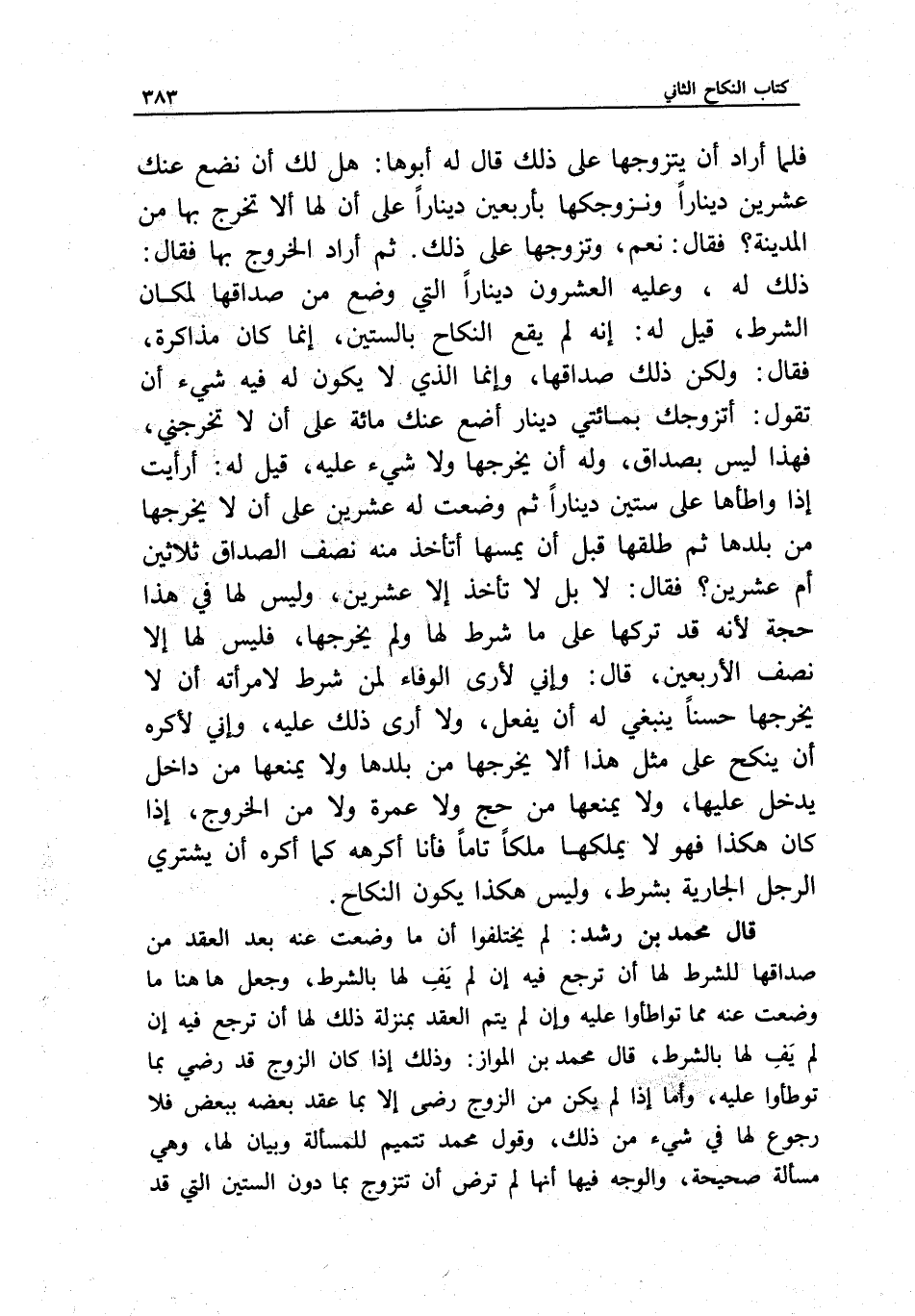 فلما أراد أن يتزوجها على ذلك قال له أبوها: هل لك أن نضع عنك عشرين دينارا ونزوجكها بأربعين دينارا على أن لها ألا تخرج بها من المدينة؟ فقال: نعم، وتزوجها على ذلك. ثم أراد الخروج بها فقال: ذلك له، وعليه العشرون دينارا التي وضع من صداقها لمكان الشرط، قيل له: إنه لم يقع النكاح بالستين، إنما كان مذاكرة، فقال: ولكن ذلك صداقها، وإنما الذي لا يكون له فيه شيء أن تقول: أتزوجك بمائتي دينار أضع عنك مائة على أن لا تخرجني، فهذا ليس بصداق، وله أن يخرجها ولا شيء عليه، قيل له: أرأيت إذا واطأها على ستين دينارا ثم وضعت له عشرين على أن لا يخرجها من بلدها، ثم طلقها قبل أن يمسها، أتأخذ منه نصف الصداق ثلاثين أم عشرين؟ فقال: لا بل لا تأخذ إلا عشرين، وليس لها في هذا حجة؛ لأنه قد تركها على ما شرط لها ولم يخرجها، فليس لها إلا نصف الأربعين، قال: وإني لأرى الوفاء لمن شرط لامرأته أن لا يخرجها حسنا ينبغي له أن يفعل، ولا أرى ذلك عليه، وإني لأكره أن ينكح على مثل هذا ألا يخرجها من بلدها ولا يمنعها من داخل يدخل عليها، ولا يمنعها من حج ولا عمرة ولا من الخروج، إذا كان هكذا فهو لا يملكها ملكا تاما، فأنا أكرهه كما أكره أن يشتري الرجل الجارية بشرط، وليس هكذا يكون النكاح.