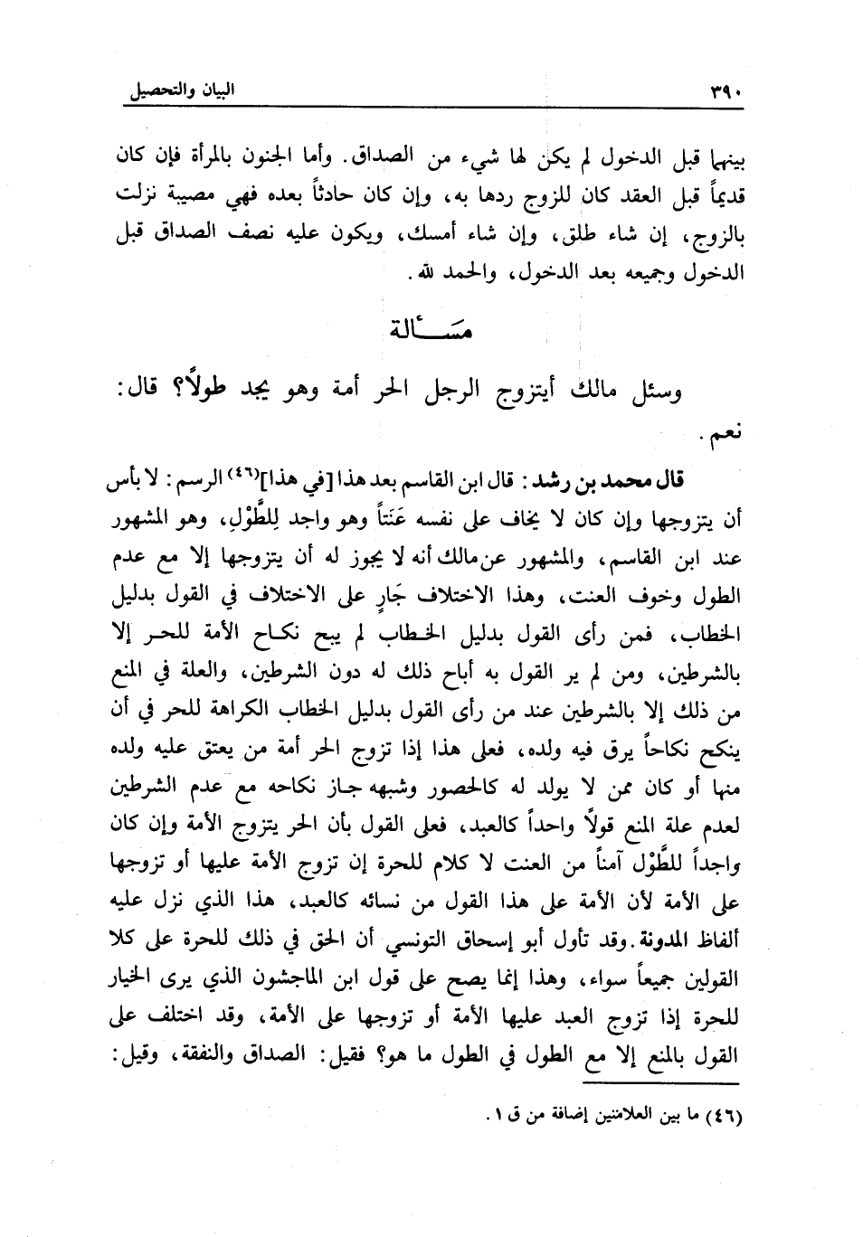 قال محمد بن رشد: قال ابن القاسم بعد هذا [في هذا] الرسم: لا بأس أن يتزوجها وإن كان لا يخاف على نفسه عنتا وهو واجد للطول، وهو المشهور عند ابن القاسم، والمشهور عن مالك أنه لا يجوز له أن يتزوجها إلا مع عدم الطول وخوف العنت، وهذا الاختلاف جار على الاختلاف في القول بدليل الخطاب، فمن رأى القول بدليل الخطاب لم يبح نكاح الأمة للحر إلا بالشرطين، ومن لم ير القول به أباح ذلك له دون الشرطين، والعلة في المنع من ذلك إلا بالشرطين عند من رأى القول بدليل الخطاب الكراهة للحر في أن ينكح نكاحا يرق فيه ولده، فعلى هذا إذا تزوج الحر أمة من يعتق عليه ولده منها أو كان ممن لا يولد له كالحصور وشبهه جاز نكاحه مع عدم الشرطين لعدم علة المنع قولا واحدا كالعبد، فعلى القول بأن الحر يتزوج الأمة وإن كان واجدا للطول آمنا من العنت لا كلام للحرة إن تزوج الأمة عليها أو تزوجها على الأمة لأن الأمة على هذا القول من نسائه كالعبد، هذا الذي نزل عليه ألفاظ المدونة. وقد تأول أبو إسحاق التونسي أن الحق في ذلك للحرة على كلا القولين جميعا سواء، وهذا إنما يصح على قول ابن الماجشون الذي يرى الخيار للحرة إذا تزوج العبد عليها الأمة أو تزوجها على الأمة، وقد اختلف على القول بالمنع إلا مع الطول في الطول ما هو؟ فقيل: الصداق والنفقة، وقيل: