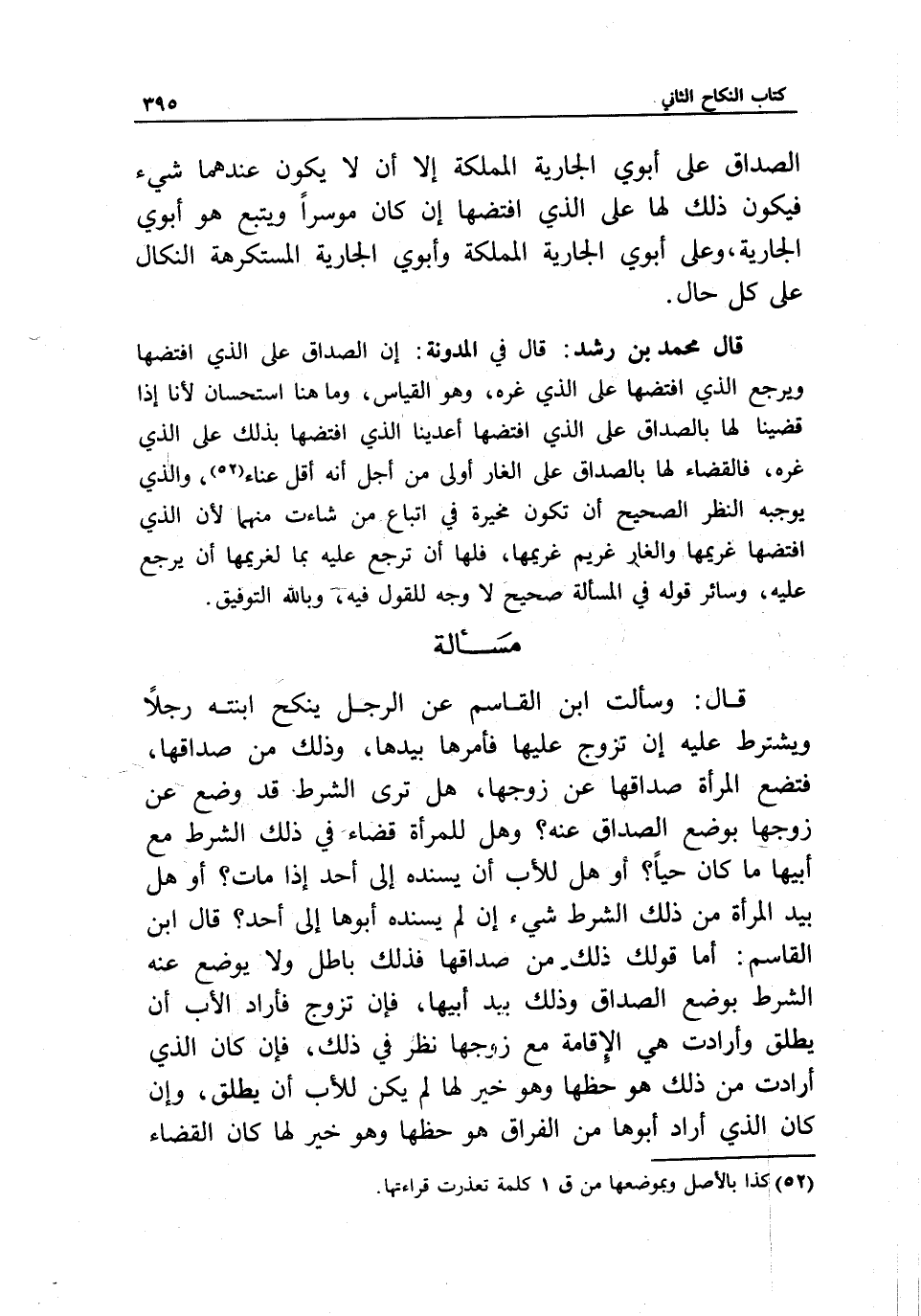 مسألة قال: وسألت ابن القاسم عن الرجل ينكح ابنته رجلا ويشترط عليه إن تزوج عليها فأمرها بيدها، وذلك من صداقها، فتضع المرأة صداقها عن زوجها، هل ترى الشرط قد وضع عن زوجها بوضع الصداق عنه؟ وهل للمرأة قضاء في ذلك الشرط مع أبيها ما كان حيا؟ أو هل للأب أن يسنده إلى أحد إذا مات؟ أو هل بيد المرأة من ذلك الشرط شيء، إن لم يسنده أبوها إلى أحد؟ قال ابن القاسم: أما قولك ذلك من صداقها فذلك باطل ولا يوضع عنه الشرط بوضع الصداق وذلك بيد أبيها، فإن تزوج فأراد الأب أن يطلق وأرادت هي الإقامة مع زوجها نظر في ذلك، فإن كان الذي أرادت من ذلك هو حظها وهو خير لها لم يكن للأب أن يطلق، وإن كان الذي أراد أبوها من الفراق هو حظها وهو خير لها كان القضاء