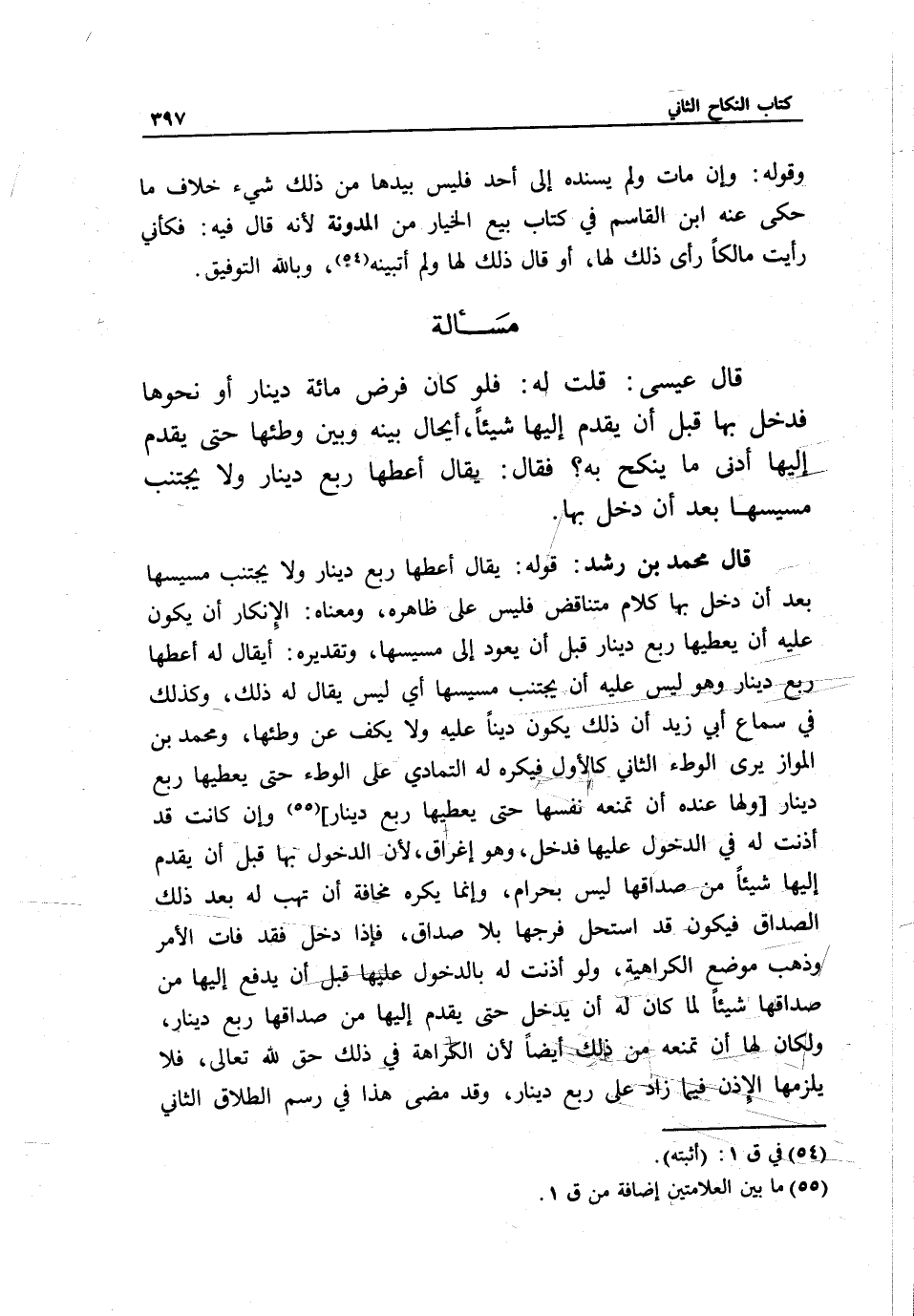مسألة قال عيسى: قلت له: فلو كان فرض مائة دينار أو نحوها فدخل بها قبل أن يقدم إليها شيئا، أيحال بينه وبين وطئها حتى يقدم إليها أدنى ما ينكح به؟ فقال: يقال أعطها ربع دينار ولا يجتنب مسيسها بعد أن دخل بها.