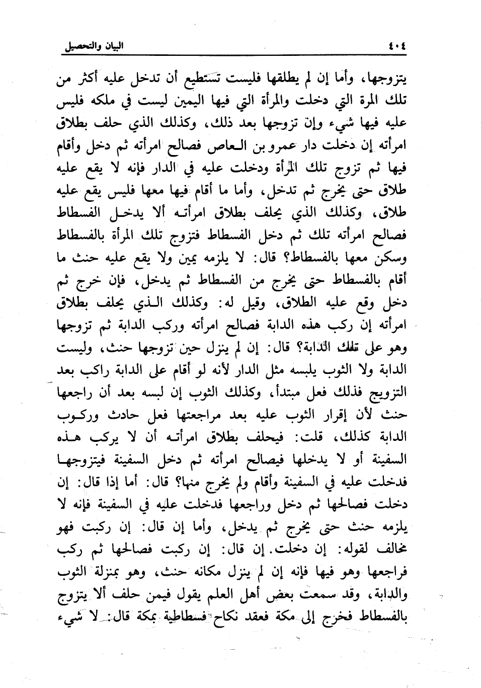يتزوجها، وأما إن لم يطلقها فليست تستطيع أن تدخل عليه أكثر من تلك المرة التي دخلت والمرأة التي فيها اليمين ليست في ملكه فليس عليه فيها شيء وإن تزوجها بعد ذلك، وكذلك الذي حلف بطلاق امرأته إن دخلت دار عمرو بن العاص فصالح امرأته ثم دخل وأقام فيها ثم تزوج تلك المرأة ودخلت عليه في الدار؛ فإنه لا يقع عليه طلاق حتى يخرج ثم تدخل، وأما ما أقام فيها معها فليس يقع عليه طلاق، وكذلك الذي يحلف بطلاق امرأته ألا يدخل الفسطاط فصالح امرأته تلك ثم دخل الفسطاط فتزوج تلك المرأة بالفسطاط وسكن معها بالفسطاط؟ قال: لا يلزمه يمين ولا يقع عليه حنث ما أقام بالفسطاط حتى يخرج من الفسطاط ثم يدخل، فإن خرج ثم دخل وقع عليه الطلاق، وقيل له: وكذلك الذي يحلف بطلاق امرأته إن ركب هذه الدابة فصالح امرأته وركب الدابة ثم تزوجها وهو على تلك الدابة؟ قال: إن لم ينزل حين تزوجها حنث، وليست الدابة ولا الثوب يلبسه مثل الدار؛ لأنه لو أقام على الدابة راكب بعد التزويج فذلك فعل مبتدأ، وكذلك الثوب إن لبسه بعد أن راجعها حنث؛ لأن إقرار الثوب عليه بعد مراجعتها فعل حادث وركوب الدابة كذلك، قلت: فيحلف بطلاق امرأته أن لا يركب هذه السفينة أو لا يدخلها فيصالح امرأته ثم دخل السفينة فيتزوجها فدخلت عليه في السفينة وأقام ولم يخرج منها؟ قال: أما إذا قال: إن دخلت فصالحها ثم دخل وراجعها فدخلت عليه في السفينة فإنه لا يلزمه حنث حتى يخرج ثم يدخل، وأما إن قال: إن ركبت فهو مخالف لقوله: إن دخلت. إن قال: إن ركبت فصالحها ثم ركب فراجعها وهو فيها فإنه إن لم ينزل مكانه حنث، وهو بمنزلة الثوب والدابة، وقد سمعت بعض أهل العلم يقول فيمن حلف ألا يتزوج بالفسطاط فخرج إلى مكة فعقد نكاح فسطاطية بمكة قال: لا شيء