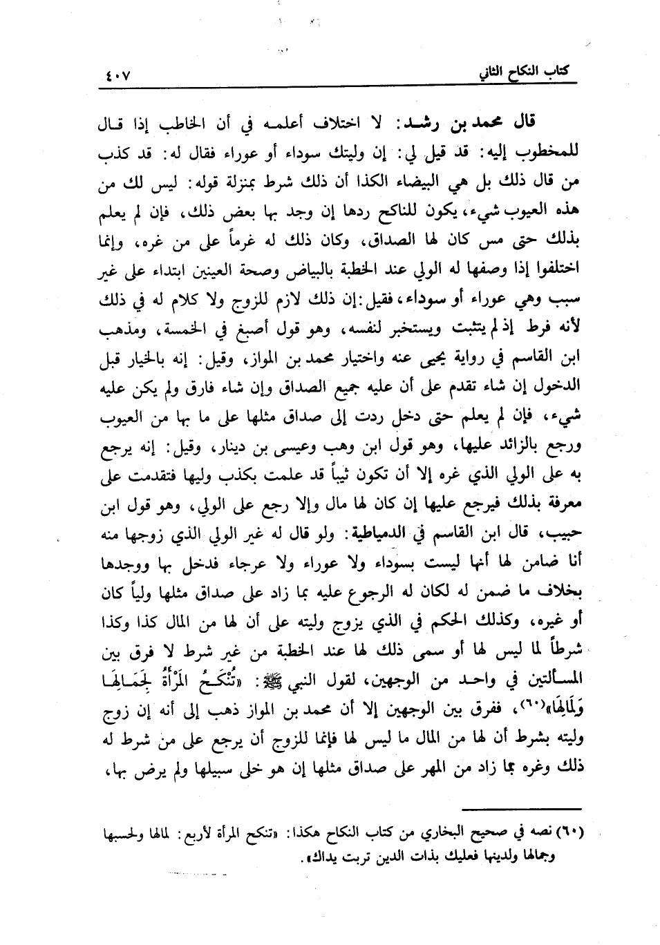 قال محمد بن رشد: لا اختلاف أعلمه في أن الخاطب إذا قال للمخطوب إليه: قد قيل لي: إن وليتك سوداء أو عوراء فقال له: قد كذب من قال ذلك بل هي البيضاء الكذا أن ذلك شرط بمنزلة قوله: ليس لك من هذه العيوب لشيء، يكون للناكح ردها إن وجد بها بعض ذلك، فإن لم يعلم بذلك حتى مس كان لها الصداق، وكان ذلك له غرما على من غره، وإنما اختلفوا إذا وصفها له الولي عند الخطبة بالبياض وصحة العينين ابتداء على غير سبب وهي عوراء أو سوداء فقيل: إن ذلك لازم للزوج ولا كلام له في ذلك لأنه فرط إذ لم يتثبت ويستخبر لنفسه، وهو قول أصبغ في الخمسة، ومذهب ابن القاسم في رواية يحيى عنه واختيار محمد بن المواز، وقيل: إنه بالخيار قبل الدخول إن شاء تقدم على أن عليه جميع الصداق وإن شاء فارق ولم يكن عليه شيء، فإن لم يعلم حتى دخل ردت إلى صداق مثلها على ما بها من العيوب ورجع بالزائد عليها، وهو قول ابن وهب وعيسى بن دينار، وقيل: إنه يرجع به على الولي الذي غره إلا أن تكون ثيبا قد علمت بكذب وليها فتقدمت على معرفة بذلك فيرجع عليها إن كان لها مال وإلا رجع على الولي، وهو قول ابن حبيب، قال ابن القاسم في الدمياطية: ولو قال له غير الولي الذي زوجها منه أنا ضامن لها أنها ليست بسوداء ولا عوراء ولا عرجاء فدخل بها ووجدها بخلاف ما ضمن له لكان له الرجوع عليه بما زاد على صداق مثلها وليا كان أو غيره، وكذلك الحكم في الذي يزوج وليته على أن لها من المال كذا وكذا شرطا لما ليس لها أو سمى ذلك لها عند الخطبة من غير شرط لا فرق بين المسألتين في واحد من الوجهين، لقول النبي - صَلَّى اللَّهُ عَلَيْهِ وَسَلَّمَ -: «تنكح المرأة لجمالها ولمالها» ، ففرق بين الوجهين إلا أن محمد بن المواز ذهب إلى أنه إن زوج وليته بشرط أن لها من المال ما ليس لها فإنما للزوج أن يرجع على من شرط له ذلك وغره بما زاد من المهر على صداق مثلها إن هو خلى سبيلها ولم يرض بها،